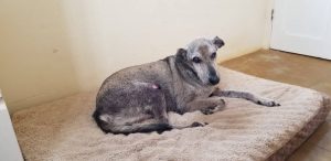 Teddy was een hoopje ellende en schuw, dus vangen zou niet makkelijk worden langs die drukke weg. Maar niks bleek minder waar. Toen ik de volgende dag met mijn bench daar kwam aan lopen, helemaal in de veronderstelling dat ik dit dagen zou gaan doen om Teddy te laten wennen aan ” eten pakken uit een bench”, liep Teddy zo de bench in om het worstje te pakken en kon ik zo het deurtje weer dicht doen. Gepiept in 1 minuut. Maar daar stond ik, hoe kreeg ik nu die bench in mijn auto? Gelukkig durfde een aardige dame die uit de botica kwam, mij te helpen. Met Teddy in de auto op naar de dierenarts. Teddy bleef in eerste instantie rustig maar toen ik hem bij de dierenarts eruit wilde halen, werd mij dat niet in dank afgenomen en …..hap, in mijn hand. We waren nog geen vrienden, vond hij.