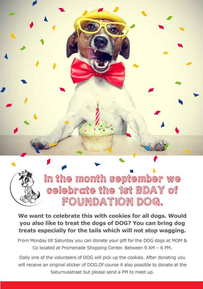 De koekjesactie gaat goed. De mand bij Magnus trust is al een keer leeg gehaald. Bij Mom&Co kan er nog wat bij. Wilt u nog graag wat brengen dan kan dat natuurlijk nog , speciaal voor de verjaardag van DOG!!!!