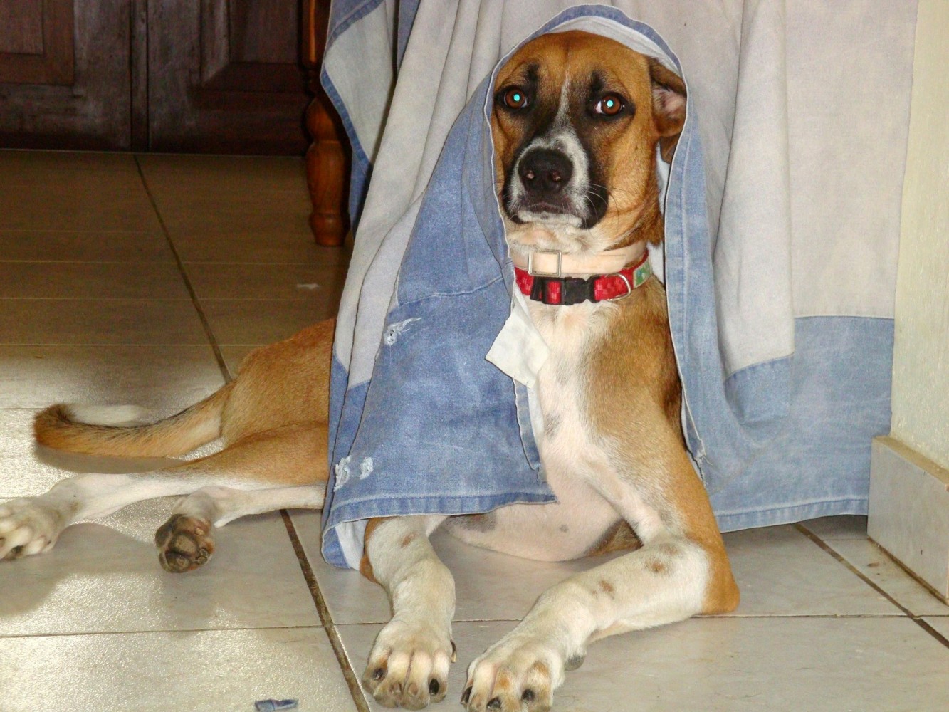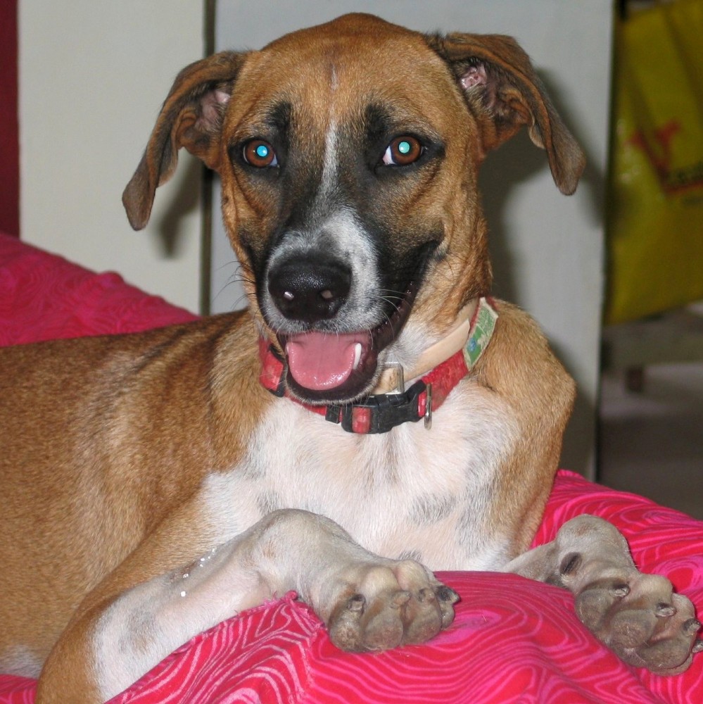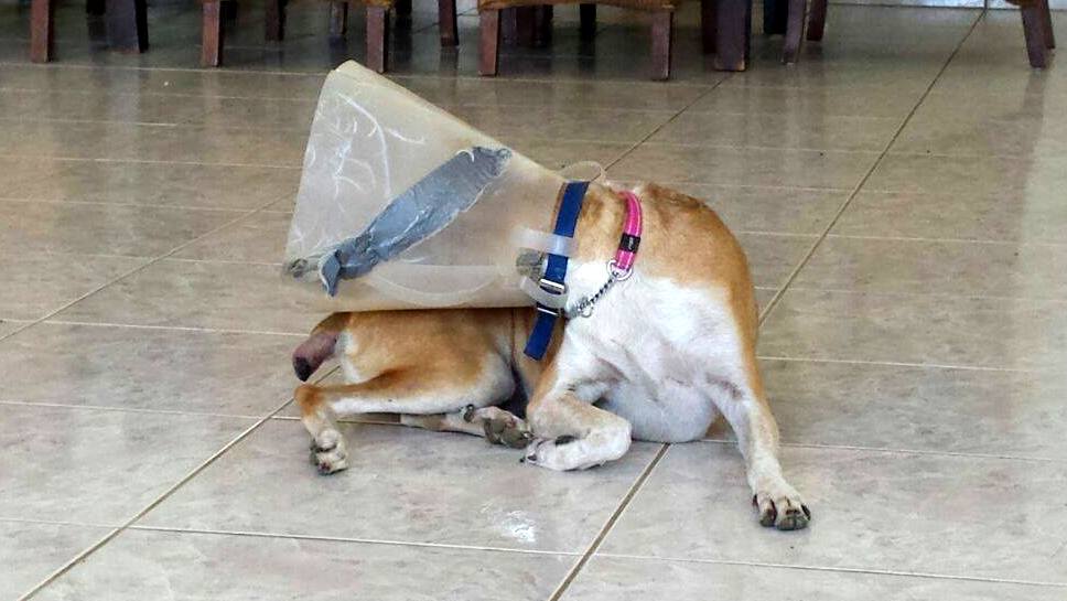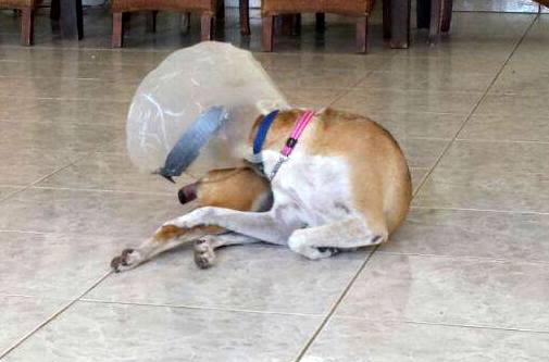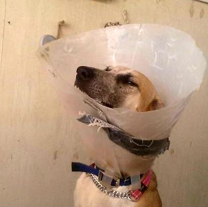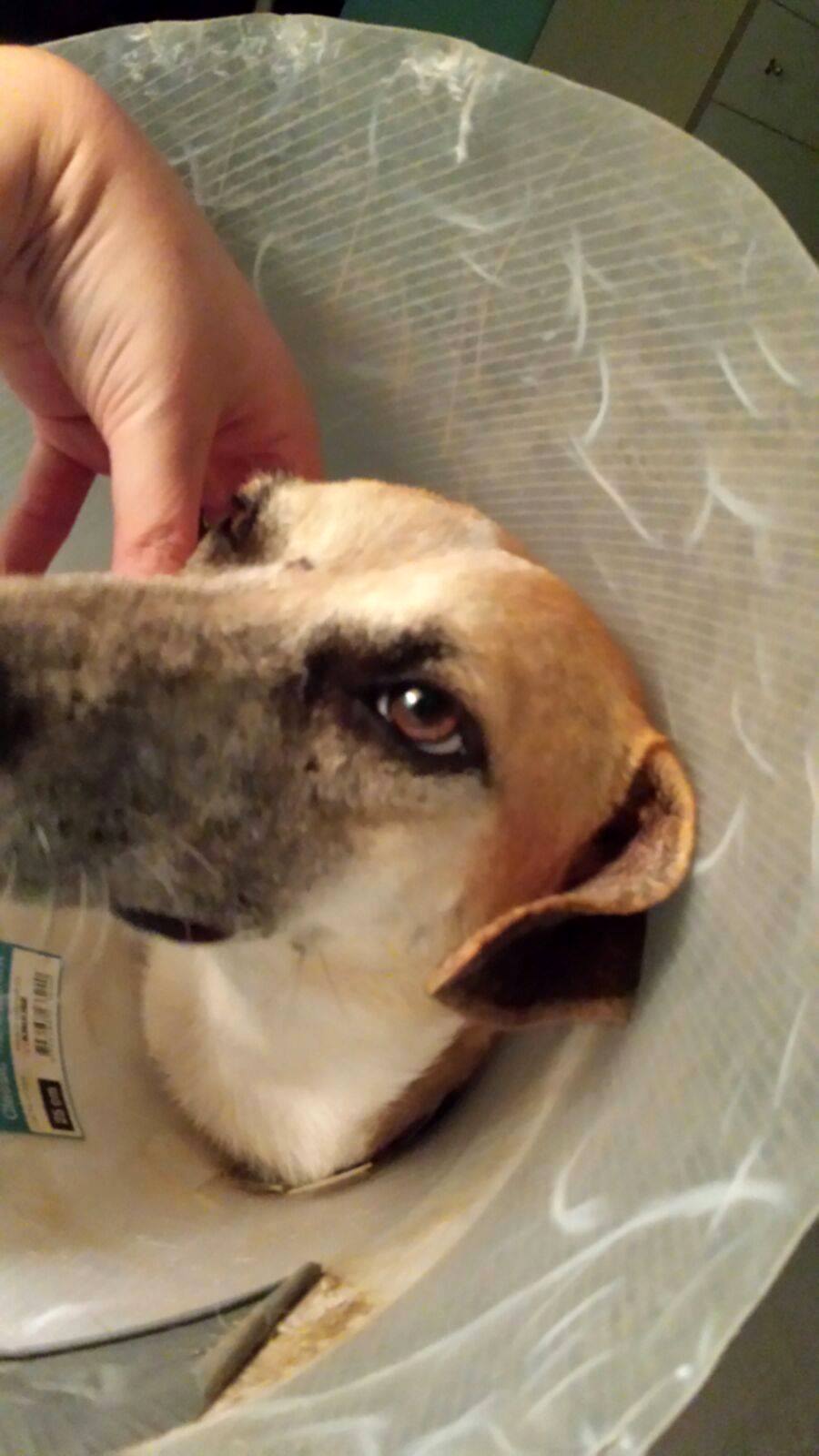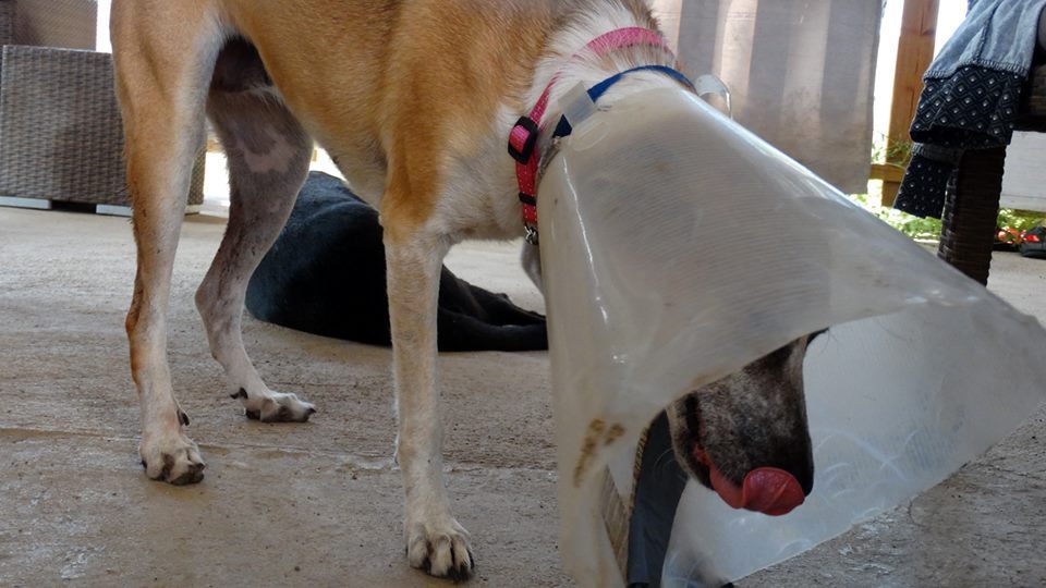 Helaas heeft Betsy ook een ongelukje gehad. Haar staart heeft of ergens tussen gezeten, of ze heeft een knauw van 1 van haar vriendjes gekregen, die net verkeerd kwam. Helaas was de wond zodanig dat een operatie noodzakelijk was en is een stukje van haar staart eraf. Arme vrolijke Bets, gelukkig heeft ze nog staart genoeg om te laten zien hoe blij ze is. Wel een tijdje een kap op, want ze mag niet aan de wond komen. Omdat ze heeeeeeel zielig is , mag ze een tijdje bij Mirjan in Casa Bak slapen. Daar krijgt ze alle liefde en vooral heel veel aandacht waar ze gek op is.  Dank je wel Mirjan!! En dank je wel dierenarts Angeli Tomsjansen en Meente Schijf.