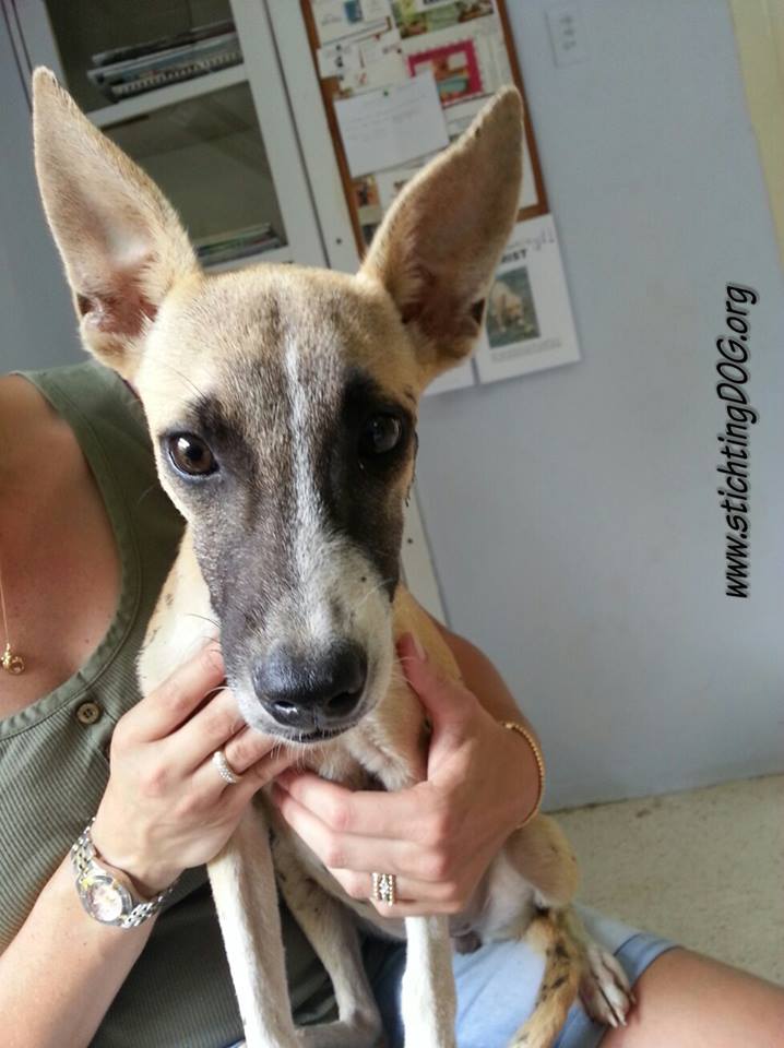 Janis is helaas nog erg bang. Ze is wel buiten geweest maar schiet als een pijl heen en weer door de tuin. Dat gaat dus wat langer duren. Maar haar 4 pups zijn ook zooooooo lief.