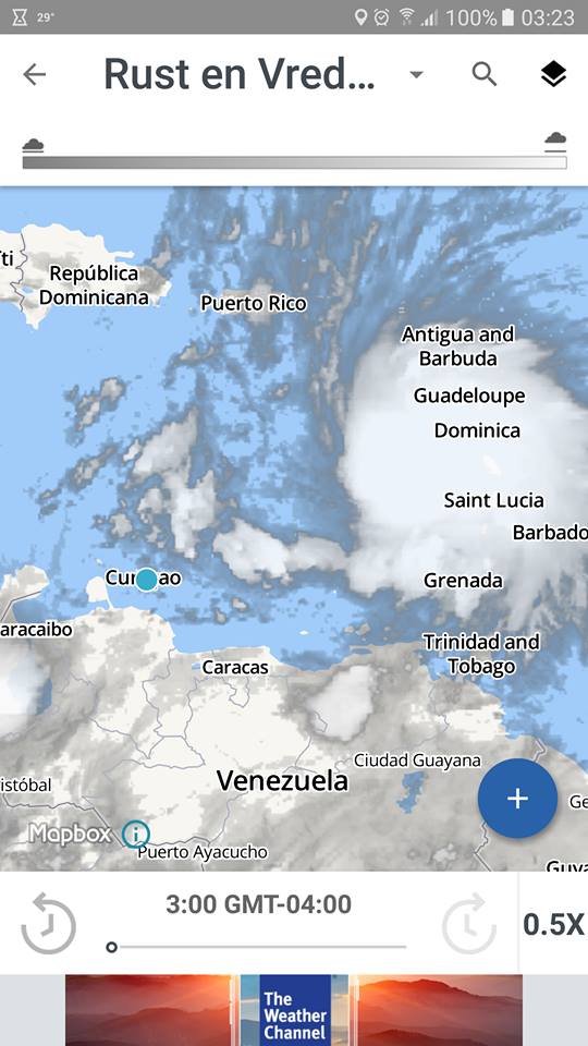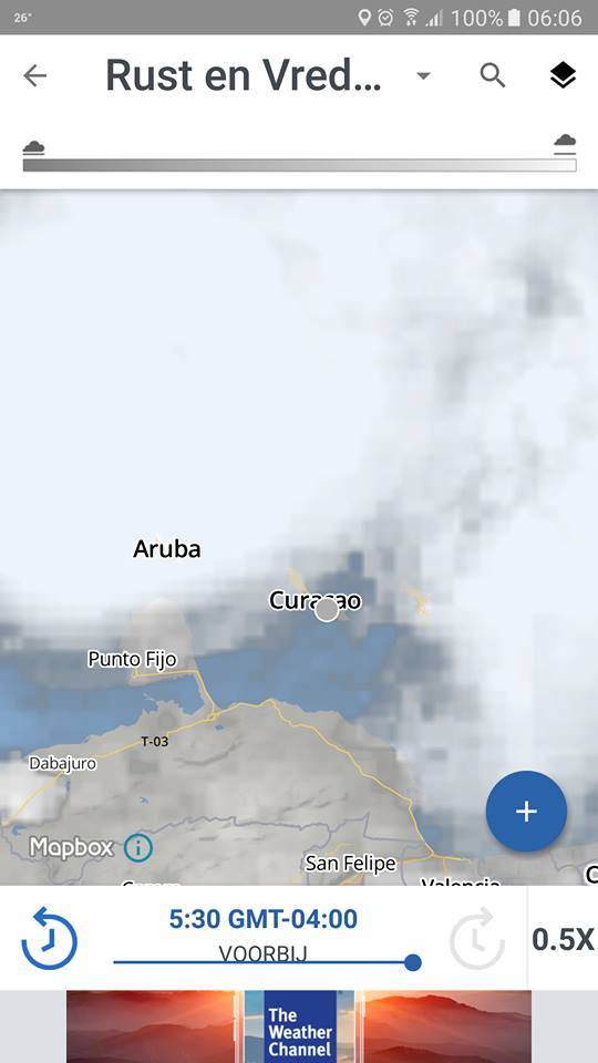 “Dat gebied blokkeerde de doorgang naar de eilanden en zo bleef alles boven de Aves eilanden hangen. Het regende daar uit en het zorgde ook dat de voeding van de orkaan vanuit het zuiden tot stilstand kwam. Had de orkaan iets hoger gezeten dan was dit niet gebeurd en hadden we wel volop in de regen gezeten.”