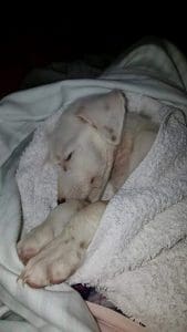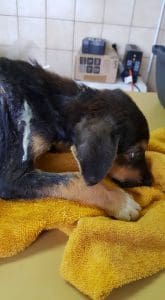 Toen kwam er een melding binnen van een aangereden hond, waarschijnlijk met pups. Diny is haar gaan halen en ze kon idd niet meer lopen. Ook was ze heel ziek. Arme Fay wat een pijn.
