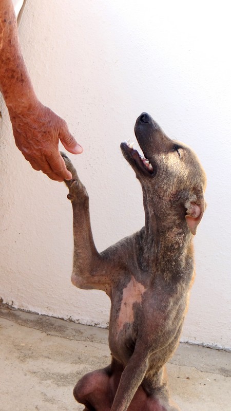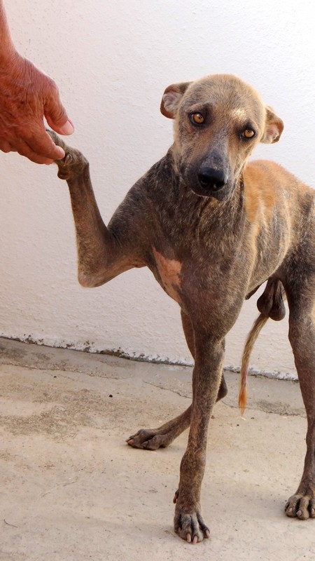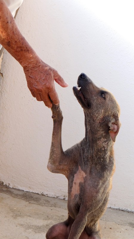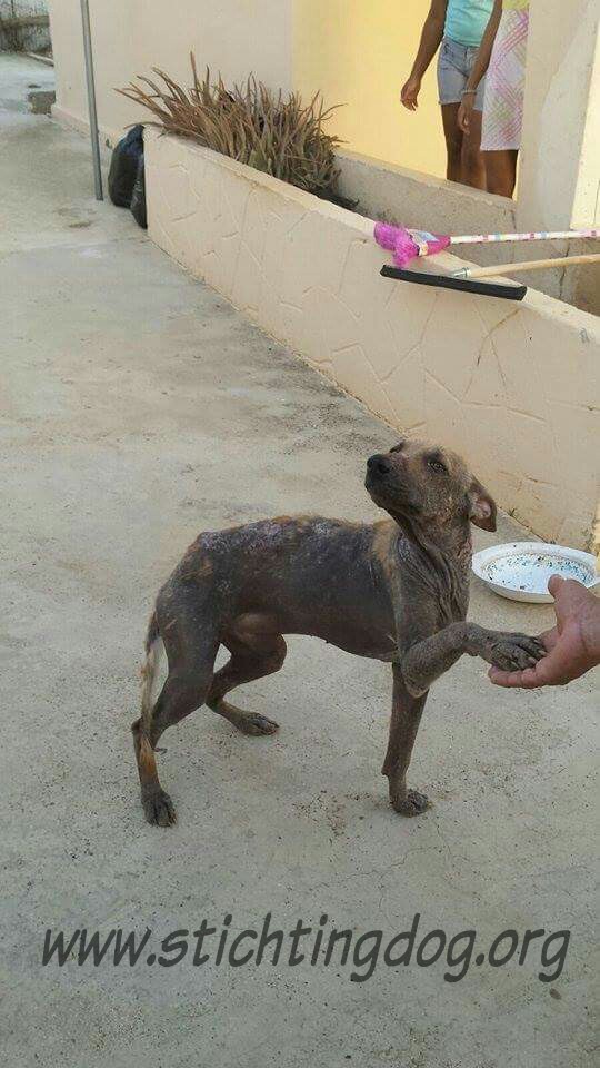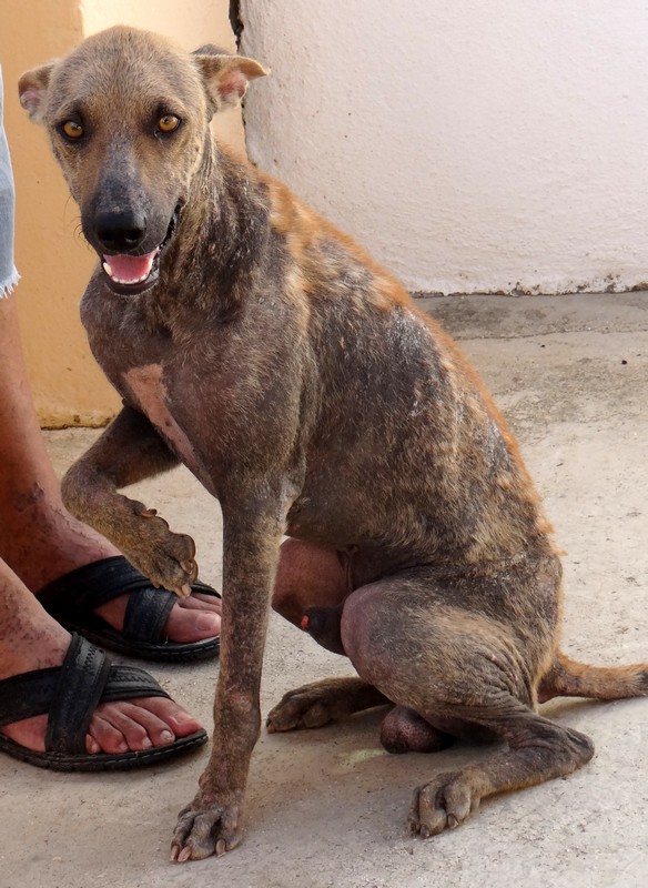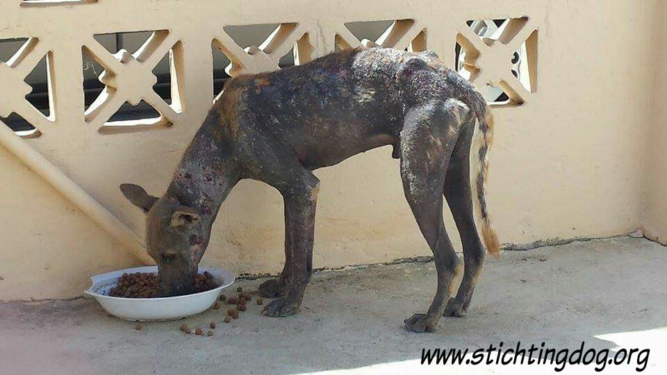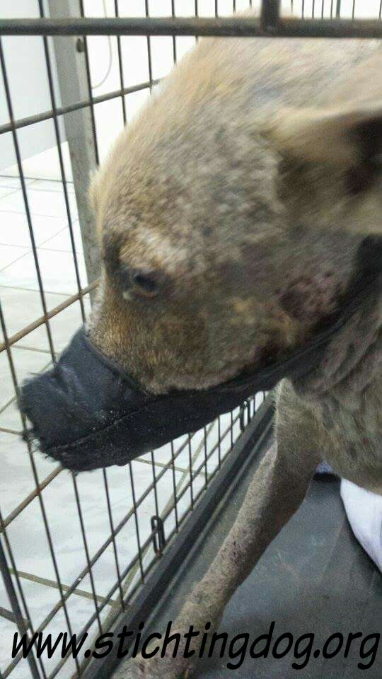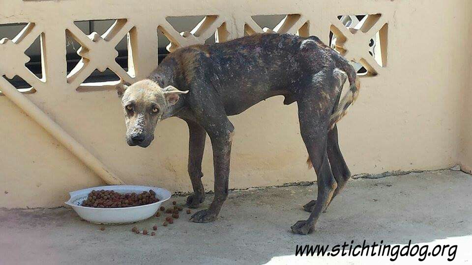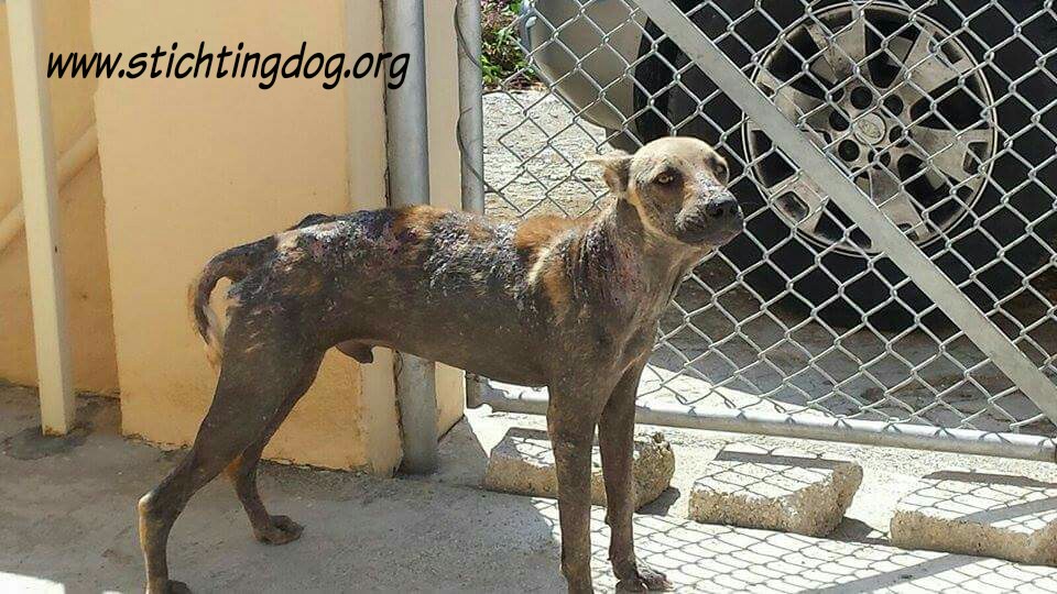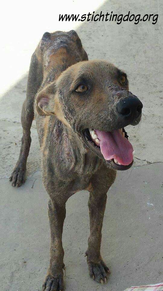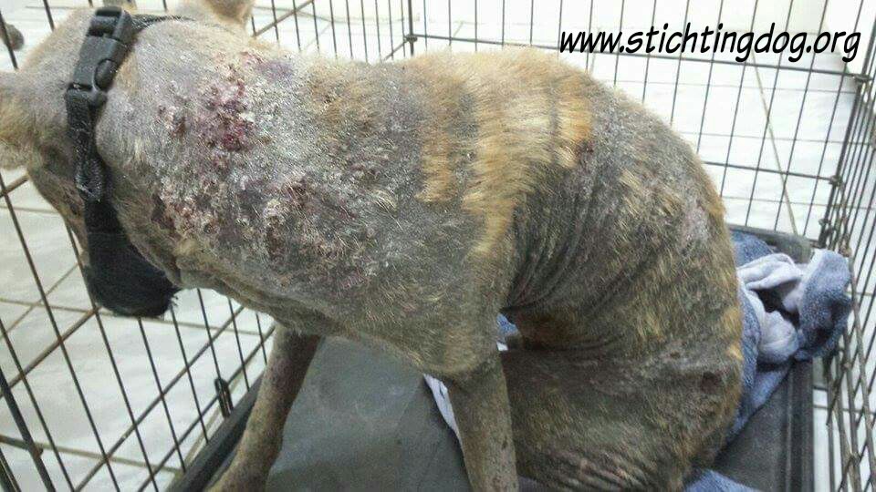En dan krijg je een melding dat iemand echt niet meer voor zijn hondje kan zorgen. En als je gaat kijken zie je dit ………… en een zeer geëmotioneerde man die gek op zijn hondje is, maar niet meer weet wat hij moet doen en geen geld heeft. Hij had eerder hulp gevraagd en gekregen maar die kwamen ineens niet meer en nu kon hij dit niet meer aanzien en vroeg of wij Brownie alsjeblieft wilden helpen. Hij kon het niet meer aan zien. Brownie is gek op zijn baasje dus die haal je niet zomaar weg. Nu is Brownie een DOG hondje maar blijft bij zijn baasje. Mirjan Seppenwoolde kon met hem naar onze lieve zorgzame dierenarts en nu krijgt Brownie medicijnen. Ook heeft Brownie meteen al super lieve afstandsbaasjes die elke maand sponsoren voor voer en heartgard. Dank je wel Eric en Lidy Heilbron. Als Brownie’s huid helemaal ok is, en hij is weer wat dikker dan gaan we hem enten en castreren.
