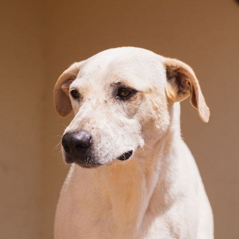 Dapper is nooit geadopteerd omdat hij doof is. Hij is een schat van een hond, lekker zelfstandig, redelijk rustig, maar hij vergt dus iets meer attentie omdat hij je niet hoort. Dapper is een lieve dikke knuffelkont.