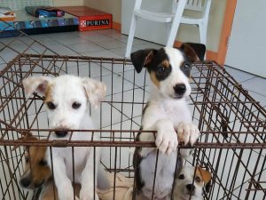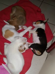 Nadat Dommeltje gevonden was langs de kant van de weg (op weg naar Tera Cora) zag de vindster een paar dagen later de broers en het zusje van Dommeltje in een tuin. De eigenaar vertelde dat de moeder van de pups was doodgereden en dat hij niks voor de pups kon doen. De 4 kleintjes zijn toen 10 dagen in quarantaine geweest en daarna naar huize DOG gekomen.