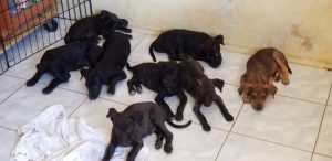 Op 4 november 2019 was er op het hele eiland een stroomstoring. Die zou tot ’s nachts duren… dus ik had om 6 uur alles netjes af, klaar en voorbereid op een donkere nacht. Op dat moment komt er een dame met dochter aan het hek. Zij hadden in de auto 7 pups, gevonden op de Bullenbaaiweg. Er zou er nog 1 lopen maar die konden ze niet vangen. Een achterlaten is geen optie dus uiteindelijk zijn de dame en dochter terug gegaan om die ene te zoeken en ik ben heel snel de 7 pups nexgard en ontworming gaan geven en heb de kamer ingericht.