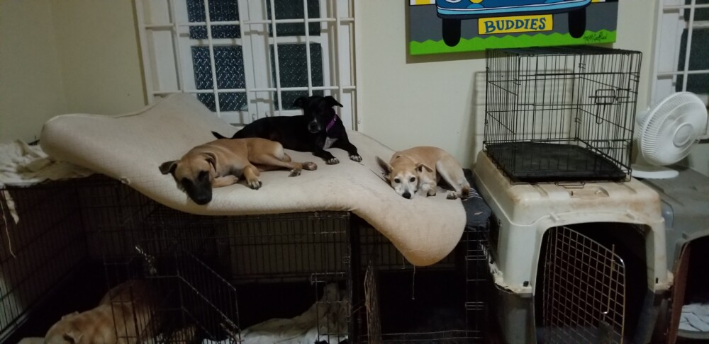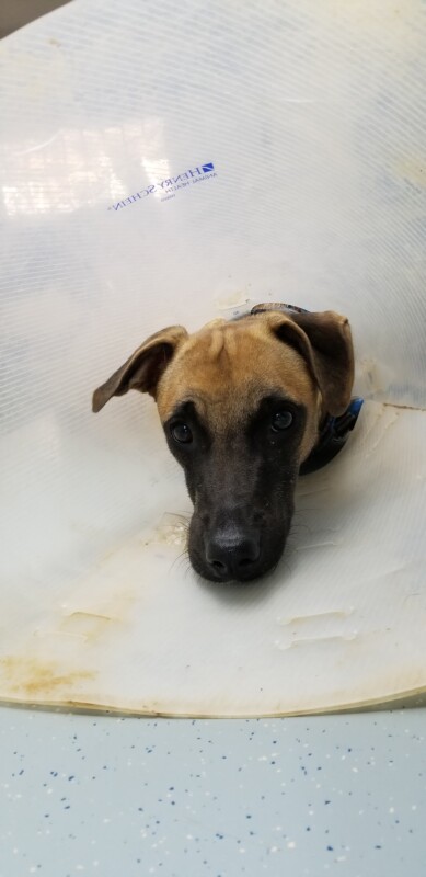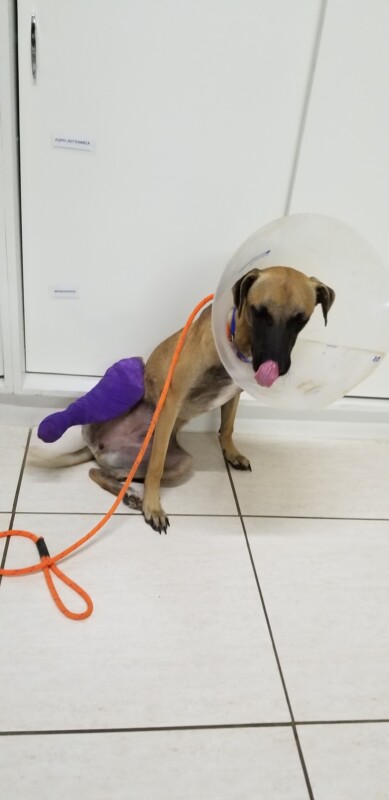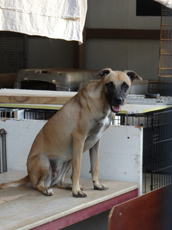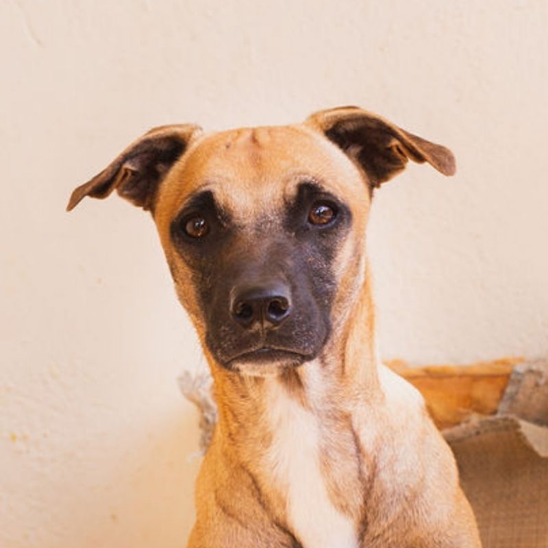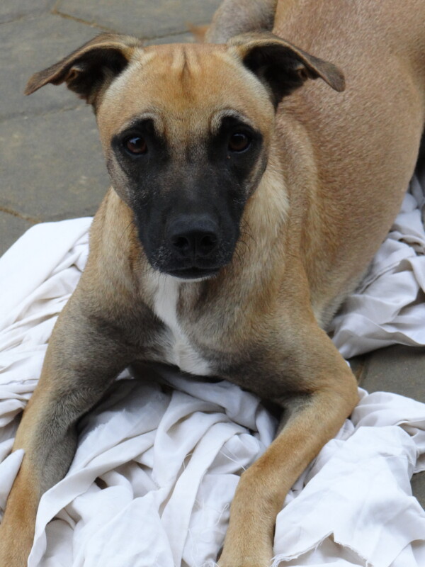 Moeder Angel werd gevonden door een security man op Scharloo, liggend met haar pups in een plantenbak, in de stromende regen. Hij heeft ze in een nisje gelegd en hulp gevraagd. Angel is met haar puppys bij ons gekomen.