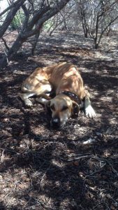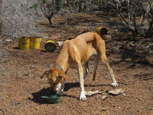 Eveline had de plek perfect uitgelegd maar ze was er niet. Na lang zoeken, zonder resultaat, hoorde Fieneke iets ver in de knoek en daar lag ze. Het kostte niet veel moeite haar te benaderen en uit de knoek te halen. Ze was duidelijk mensen gewend en hongerig.