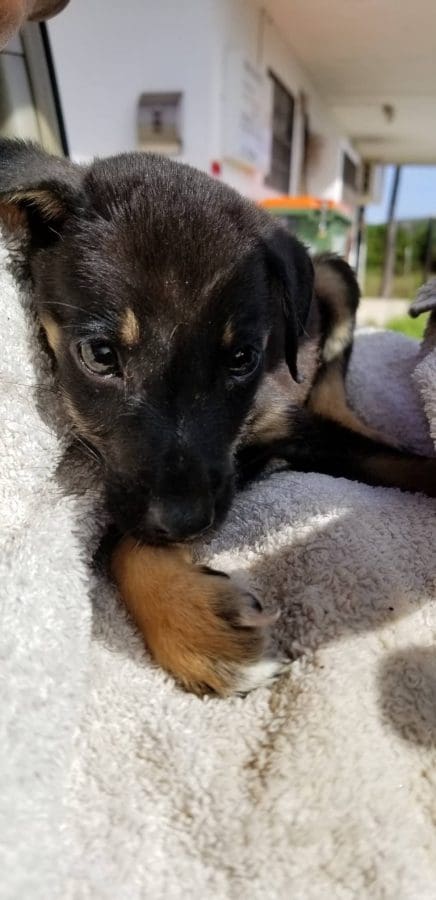 Holly werd gevonden in Roi Rincon in nov 2018. Ze lag daar met haar 7 kleine 4 weken oude baby’s. Gedumpt als oud vuil.