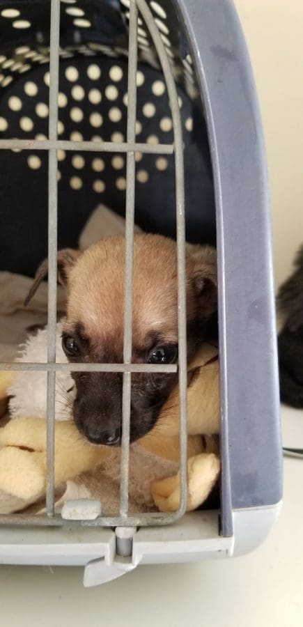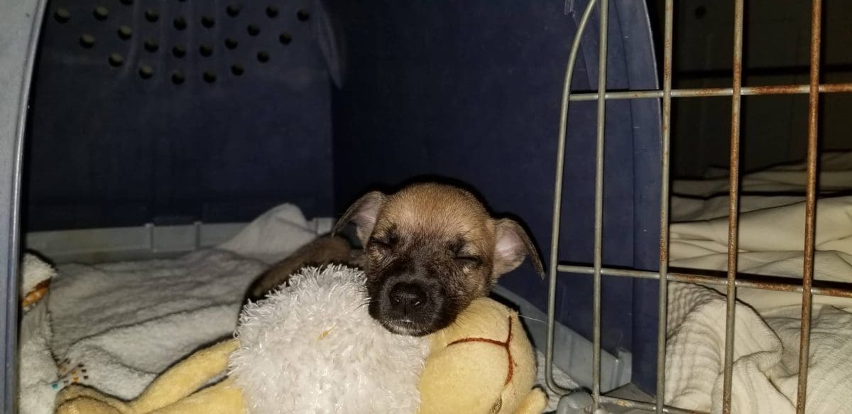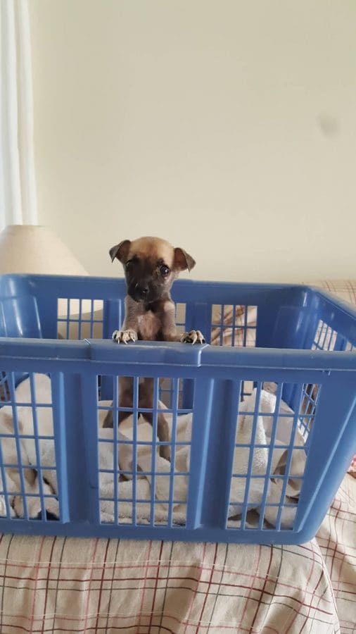Ariadne vond ze en maakte van een doos wat beschutting. Maar het weer zag er slecht uit. Heftige regenbuien waren op komst dus moesten ze daar echt weg. Ariadne heeft toen Holly gevangen met de vangkooi en samen met de kleintjes naar DOG gebracht.
