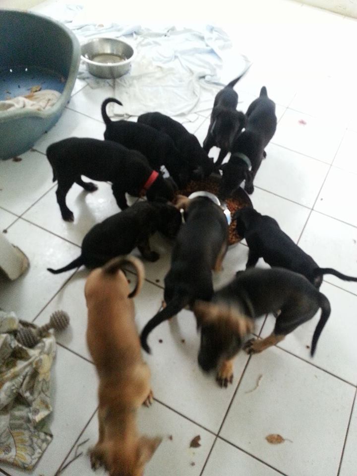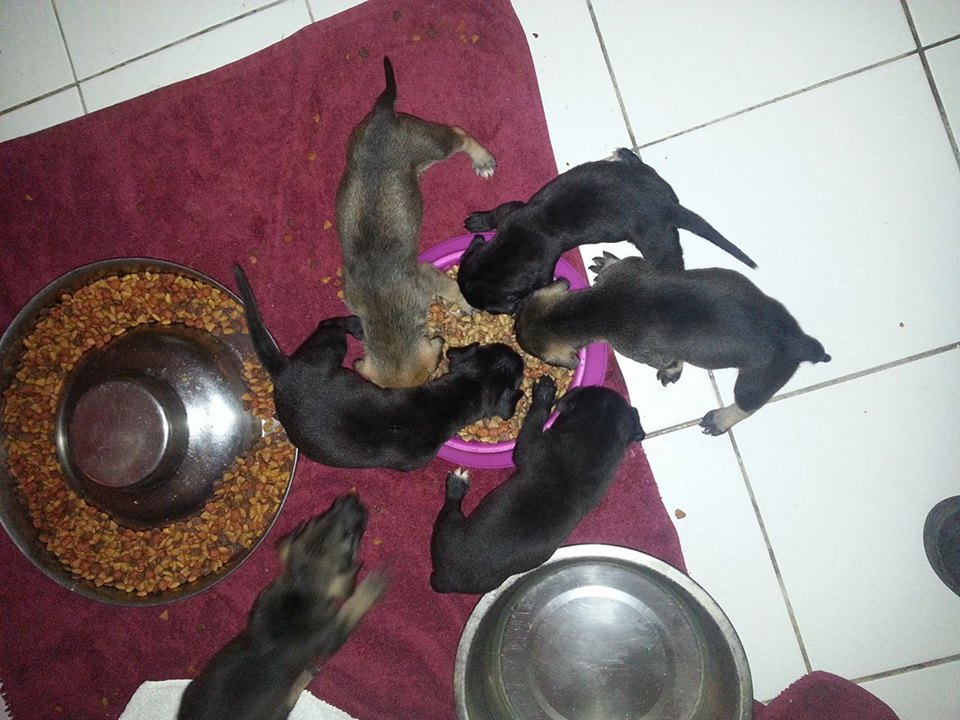 De pups groeien, spelen, eten en slapen met elkaar. Moeder Kyla is na 6 weken terug gegaan naar haar eigenaar. De 4 Janis pups zijn nog 2 weken bij Janis gebleven. Toen kreeg Janis een bloedneus. Dat betekent karpatenziekte dus aan de doxy. De pups mogen dan niet meer bij haar drinken dus die gingen “alleen ” verder. En dat ging prima ze groeien als kool.