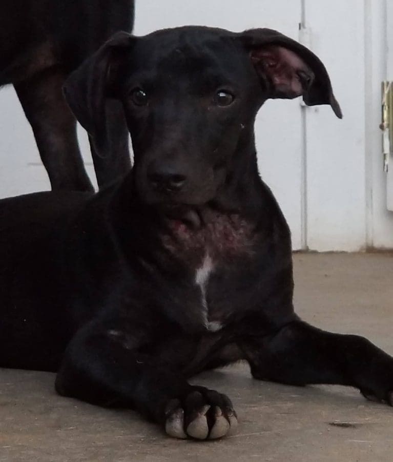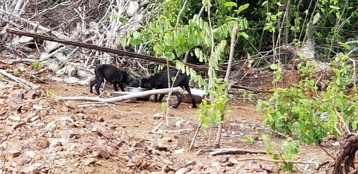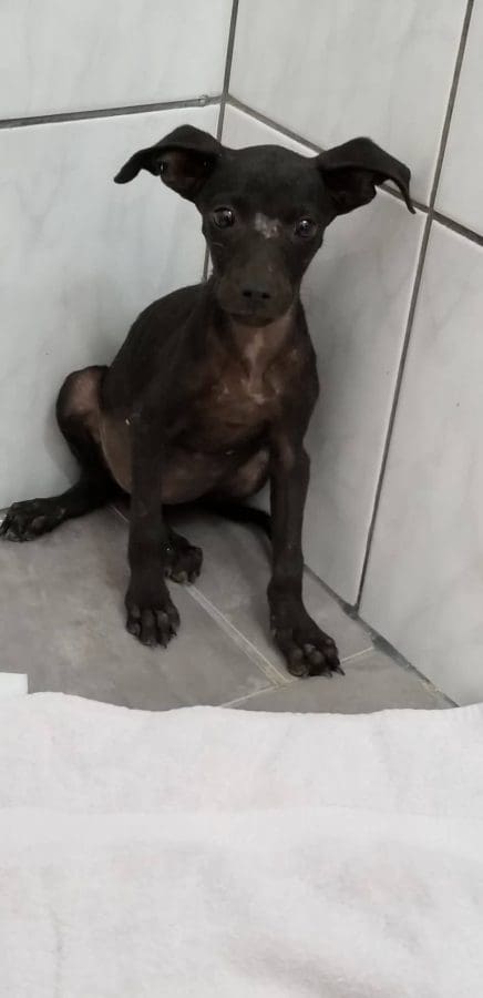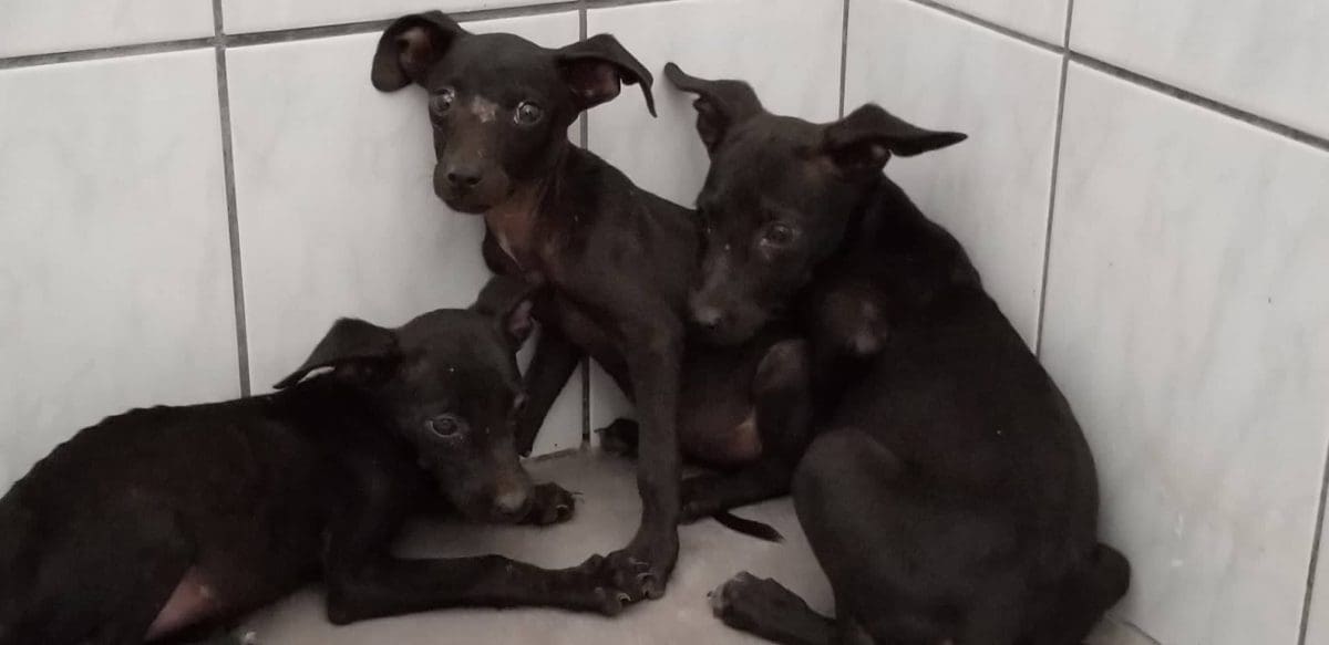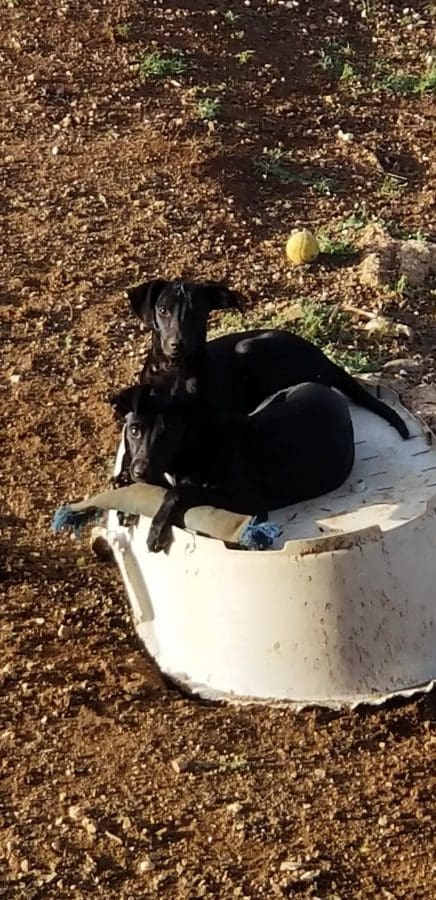 Op een middag in oktober 2018 hoorde ik geluid in de knoek naast de sanctuary. Het leek alsof er puppys zaten maar ik zag niks. Een paar dagen later zag de aannemer 2 zwarte pups, dus voer en water gezet en idd binnen een half uur kwamen ze eten. Heel erg schuw dus toen ik me liet zien waren ze meteen weg. Ik heb toen de vangkooi gezet en ik was nog niet weg en hoorde de klap al. Pup nummer 1, die was boos en agressief; blaffen en happen. Veilig gezet en op naar nummer 2. Tot mijn verbazing liepen er nog steeds 2 in de knoek… het waren er dus 3. Nummer 2 liep er ook zo in, maar 3 dacht wat langer na, en pas eind van de middag hoorde ik de klap van de vangkooi. Alle 3 de dames gevangen.