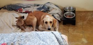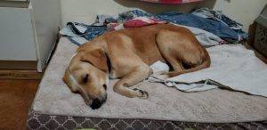 In Julianadorp liep een hoogzwanger beige hond rond. Ze was al door verschillende mensen gezien en door 1 gemeld. Toen ik bij foster Bianca de pups ging halen, vertelde ze dat haar over buren een zwangere hond net van straat hadden gehaald. Dat was dus Julie. Ik heb Julie meteen naar de dierenarts gebracht en dezelfde dag is ze gesteriliseerd. Ze heeft daarna een paar weken bij Mijn zusje gelogeerd waar ze alle aandacht kreeg en helemaal bij kon komen.