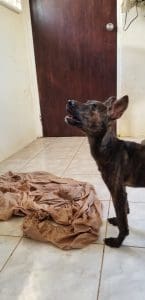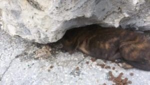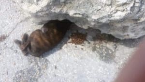 In juni 2019 stond op FB een post met deze foto’s, gemaakt in Mahuma. Het beestje bleef zo liggen ondanks dat er eten neer gezet werd. Gelukkig hebben mensen van een bedrijf daar dichtbij haar er onderuit gehaald en meegenomen. Ze bleek ok, en na wat dagen eten en spelen was Mette helemaal het dametje met een ijzeren willetje.