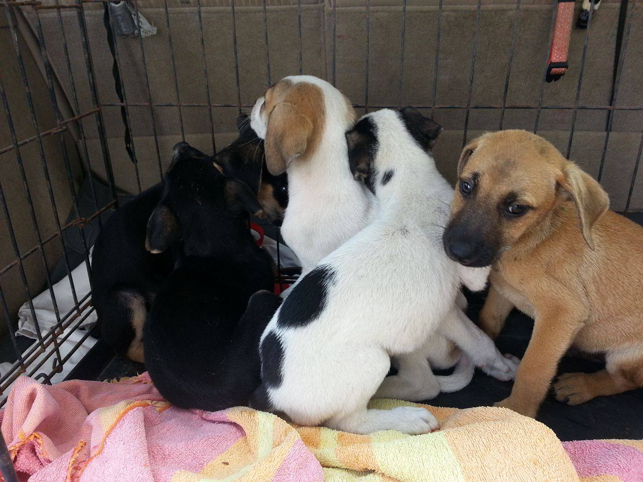 Op zaterdag 6 februari kreeg ik een berichtje van Alex Roose dat hij tijdens het schoonmaken van een stuk knoek vlak bij Julianadorp , 5 puppy’s had gevonden. Ik ben er heen gereden en de pups waren vrij makkelijk te vangen. Duidelijk mensen gewend , wel wat schuw maar niet vreselijk bang.