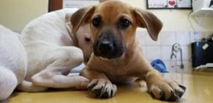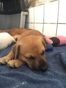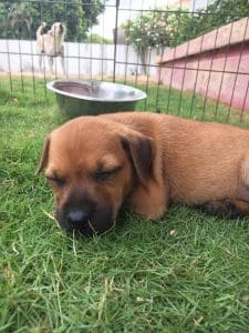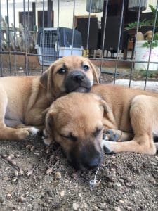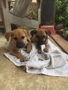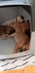 Wouter zag in juni 2019 puppy’s lopen bij Bullenbaai. De moeder was erbij maar ze lagen vlak langs de weg en daar was het niet veilig.  We zijn ze gaan vangen maar dat bleek niet makkelijk. De eerste 2 lukten maar de volgende dag moesten we weer terug.Samen met Sandra van Kunuku Resort en Wouter de vangkooi uitegezet. Uiteindelijk hebben we 7 gevangen, maar mama en 1 pup waren ons te slim af.
