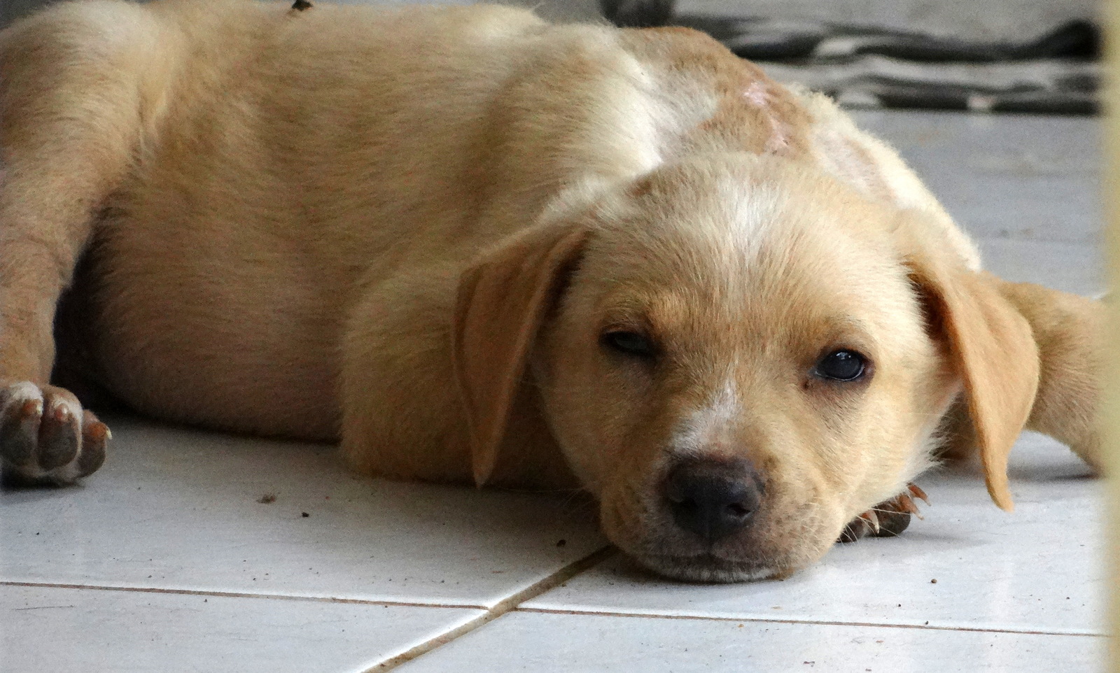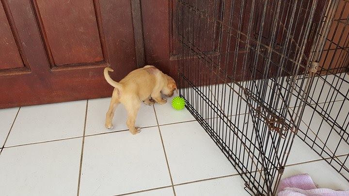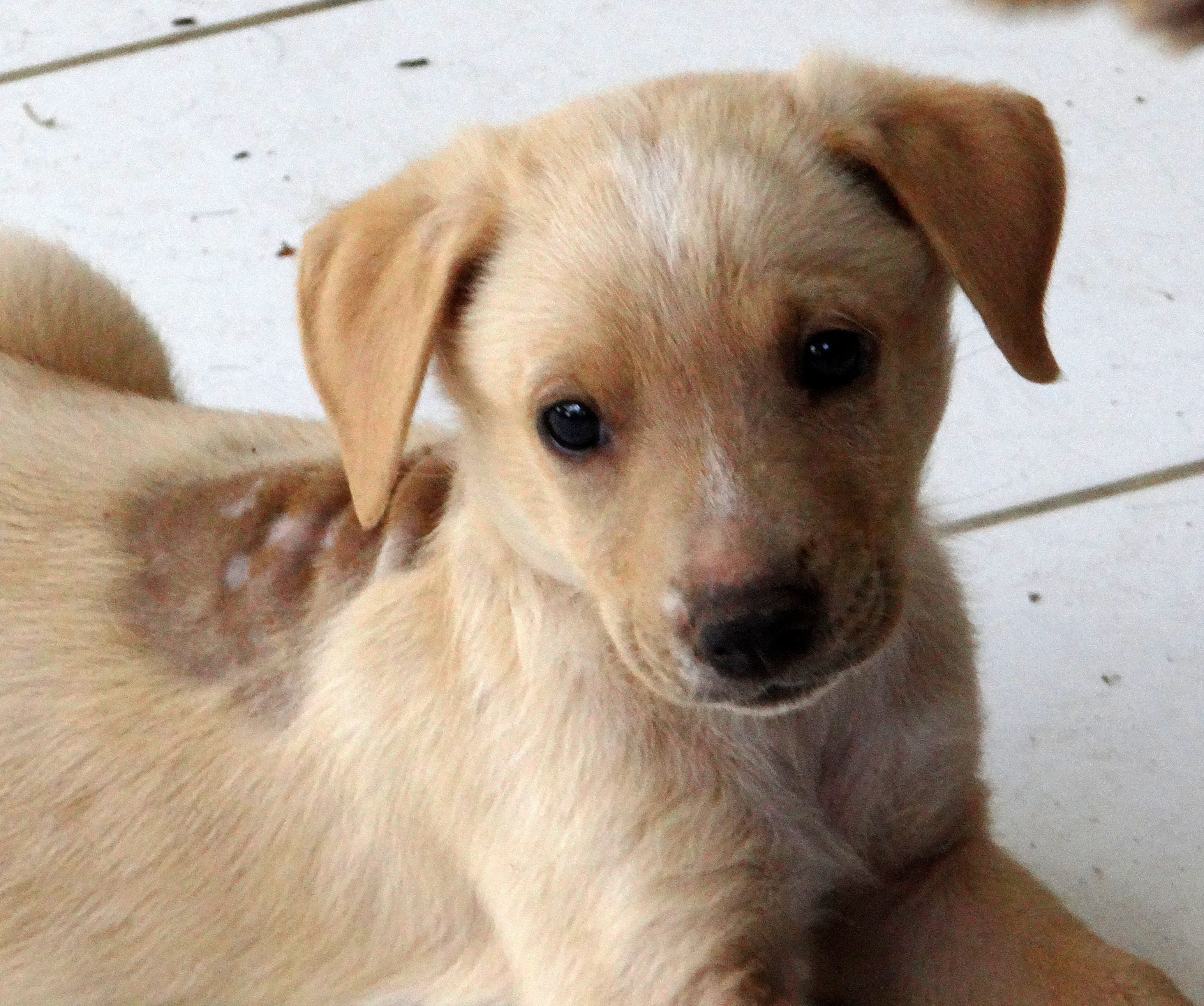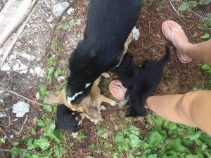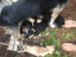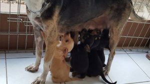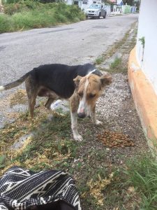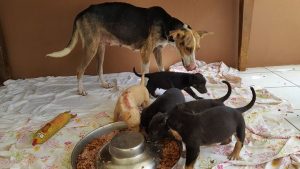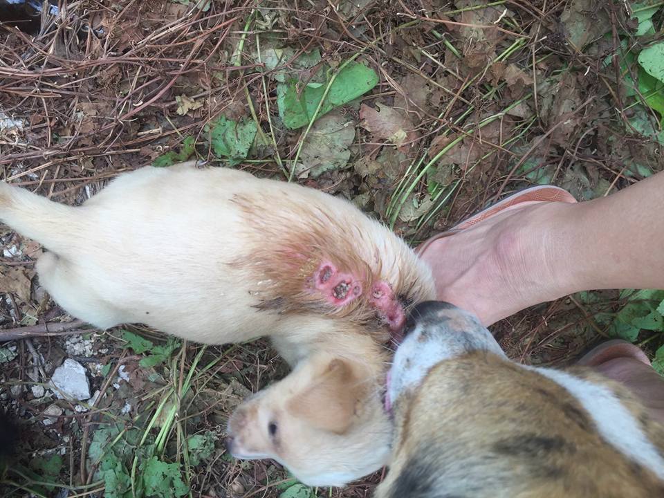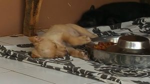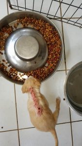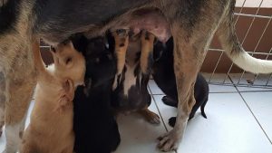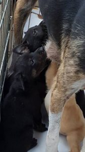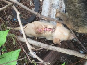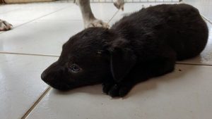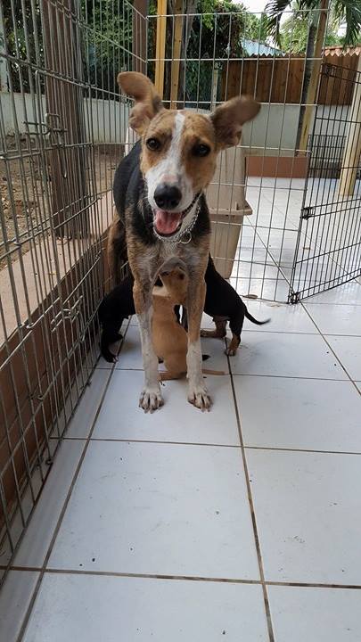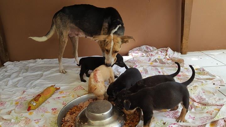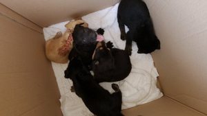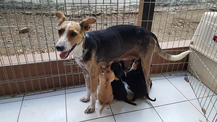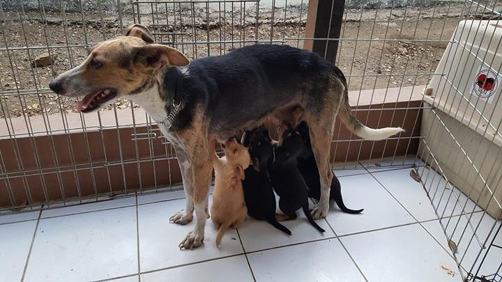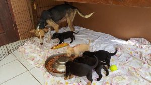 Op 10 april werd Noëlle gesignaleerd op Mundo Nobo. Ze had duidelijk pups en was ook 1 pup doodgereden in de buurt. Dus na zoeken vond Chantal het nestje, 5 zwarte en 1 blonde pup. De blonde had echter een open wond op de rug vol maden en maden eitjes. Dus ze moet echt naar een dierenarts.