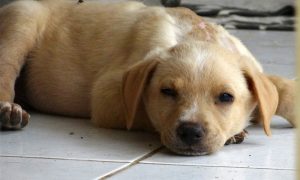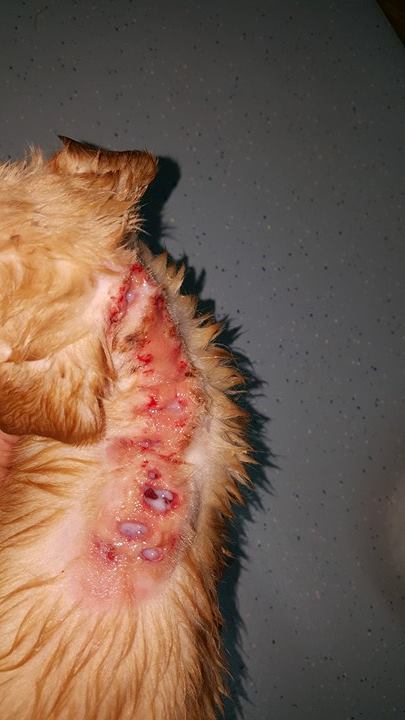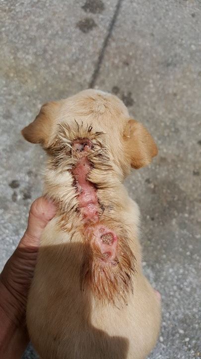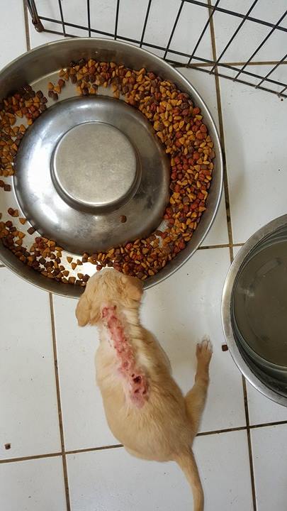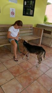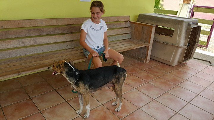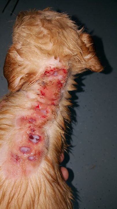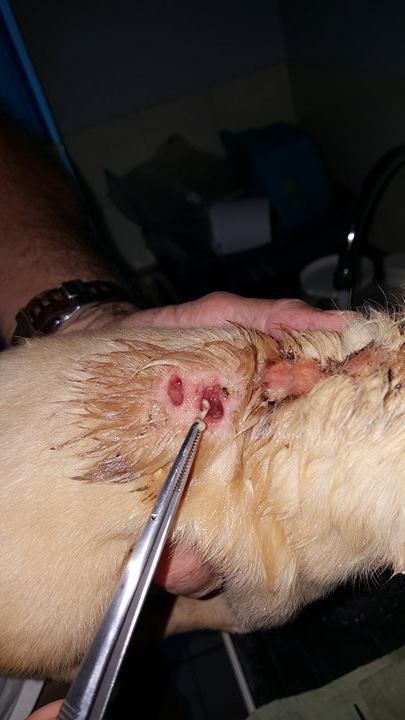 De pups hadden we zo mee en ook mama Noëlle was lief en aanhankelijk. Eerst naar de dierenarts. Daar zijn de maden met een pincet eruitgehaald en is de wond verschoond.