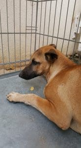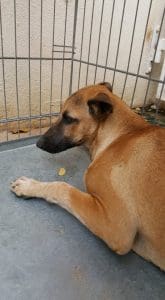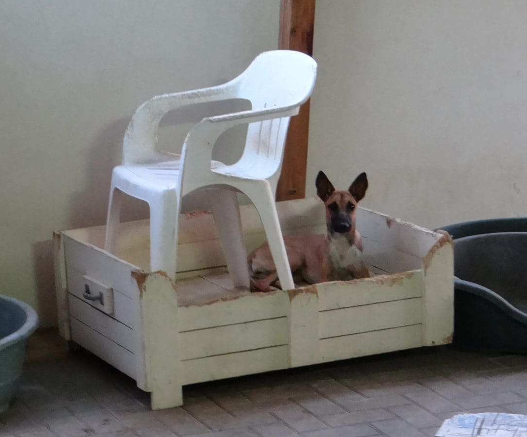 Nova is een hele schuwe hond die alleen in de hoek van de tuin zit als er mensen zijn. Met de andere honden voelt ze zich wel beter. Ze is inmiddels gesteriliseerd.