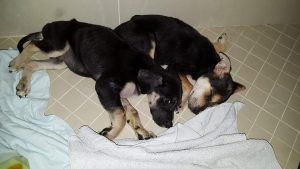 In de grote vakantie (juli 2017) belde een meneer mij op dat hij puppy’s had gevonden. Hij wist niet precies hoeveel het er waren maar zonder moeder gedumpt.  Ik had in DOG geen plek meer maar wilde de man graag helpen. Samen met Fien gingen we erheen en verwachtten een paar zielige pups te vinden. Tot onze verbazing zaten er 9 gezonde pups in de rotsen, 3 grote (de Royals) en 6 kleintje ( de Piscas) . We konden ze zo uit de rotsen plukken. De man vertelde dat hij 3 x langs deze plek was gereden vandaag en toen was er niks en nu de 4de keer zaten er ineens 9 pups.