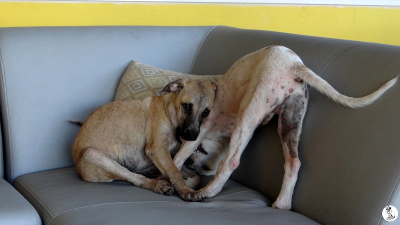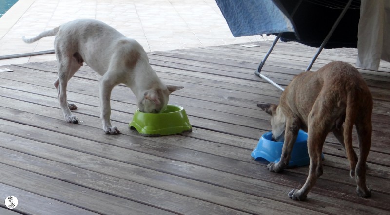 Het zijn 2 vrolijke blije hondjes. Dikke buikjes (van de wormen).