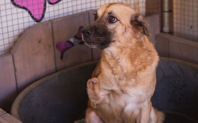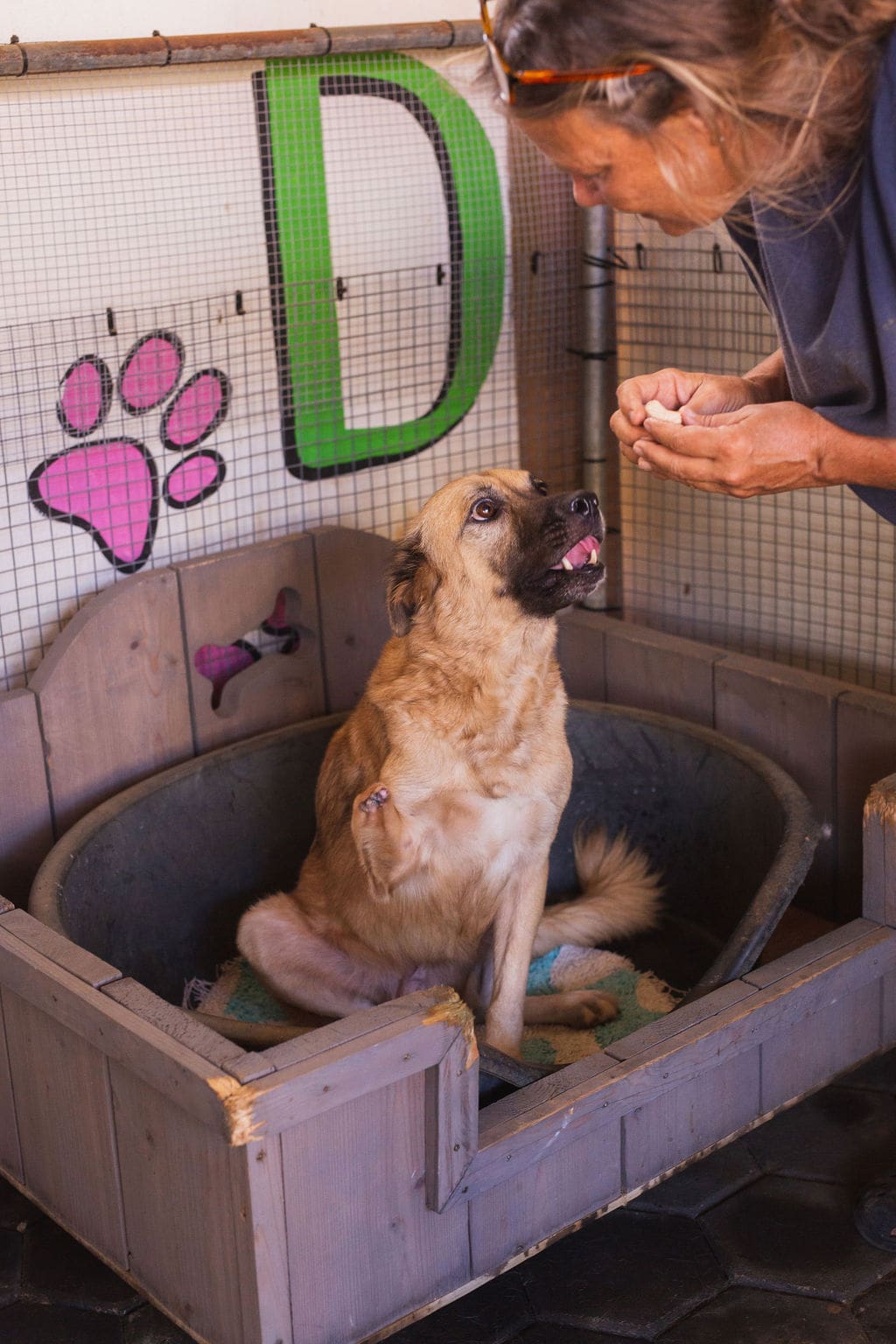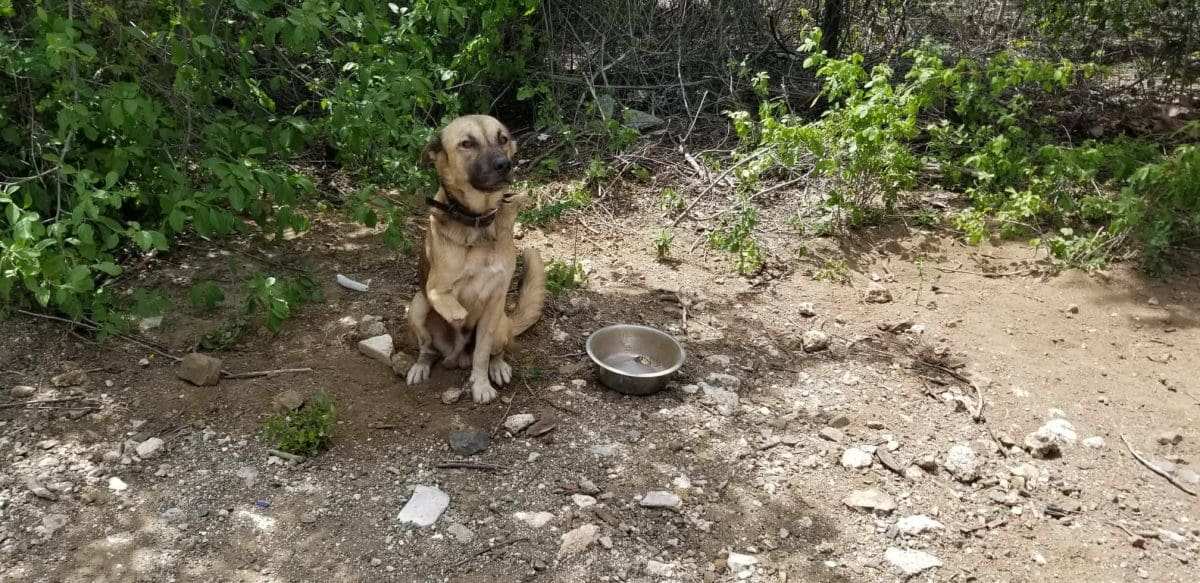 Op 6 nov 2019 kregen we van Alex Roose een appje dat hij een hond met een halve voorpoot had zien liggen bij Bullenbaai. We zijn er heen gegaan en daar lag hij… Niet echt bang, wel wat afwachtend maar ik kon hem zo meenemen en naar de Sanctuary brengen.