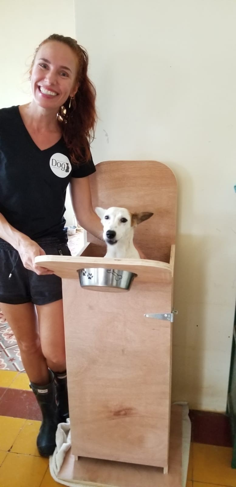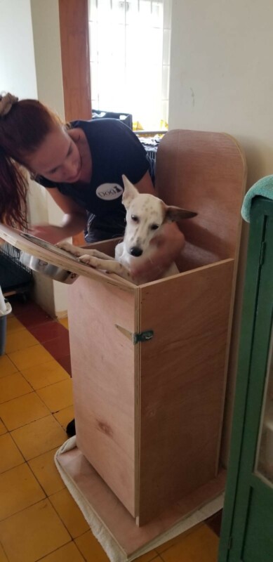 De man van één van onze vrijwilligers heeft de stoel geweldig nagemaakt en Shawna begreep gelukkig gelijk wat de bedoeling was! Shawna blijft een zorgenhondje, maar dat ze al zo ver is gekomen is knap en we houden haar goed in de gaten.