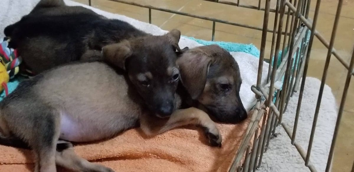 Op FB stonden deze 2 foto’s met de tekst ‘pups bij Roi Rincon gedumpt’. De gebogen verslagen, houding van het pupje ging bij mij door merg en been. Wat moet er door het kleine hummeltjes hoofdje gaan… Gelukkig kon Ariadne ze de volgende dag ophalen, wat een hummeltjes. Moe en hongerig…dus snel lekker veilig bedje gemaakt,, eten, drinken en lekker slapen.