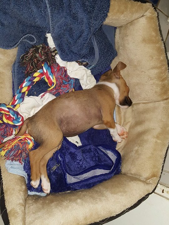 Meteen naar de dierenarts en redelijk gezond ( wat vlooien en luizen, bloedarmoede en moe) kom je in Puppy Paradise. Eerst maar even lekker een nachtje bij komen. Morgen wil je vast spelen met de anderen.