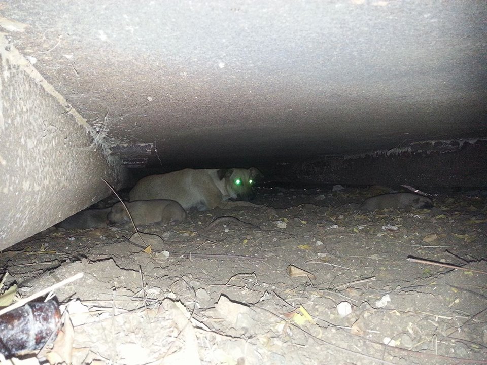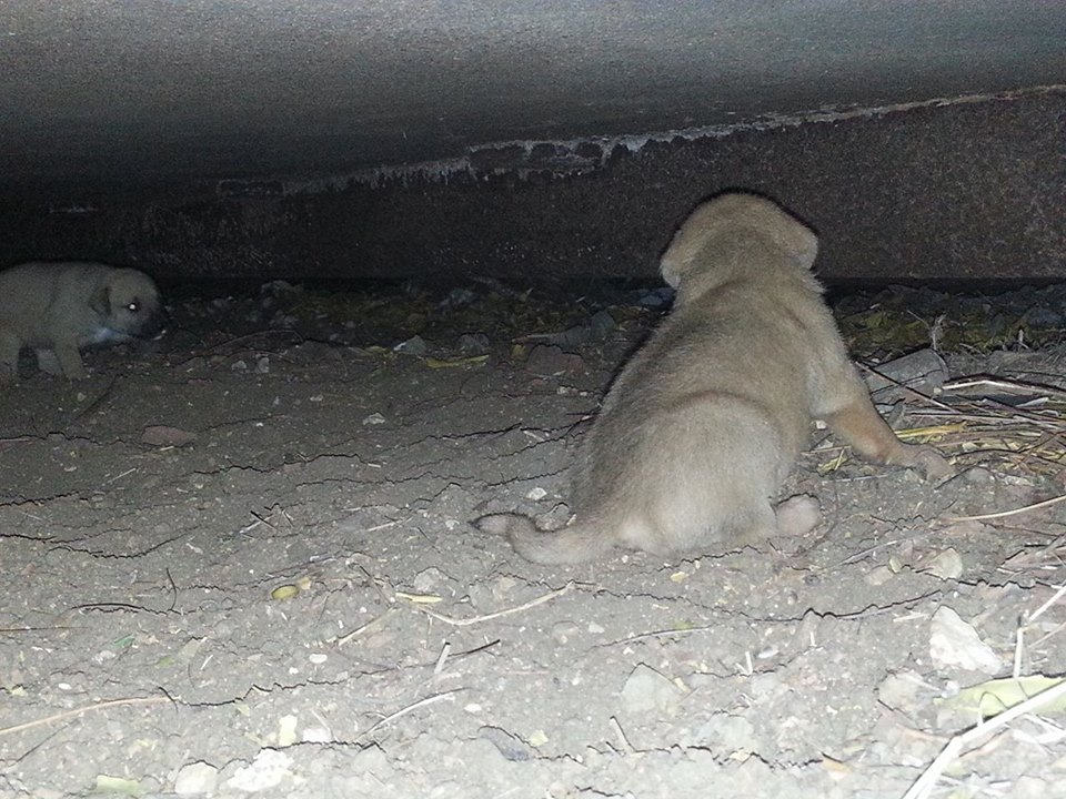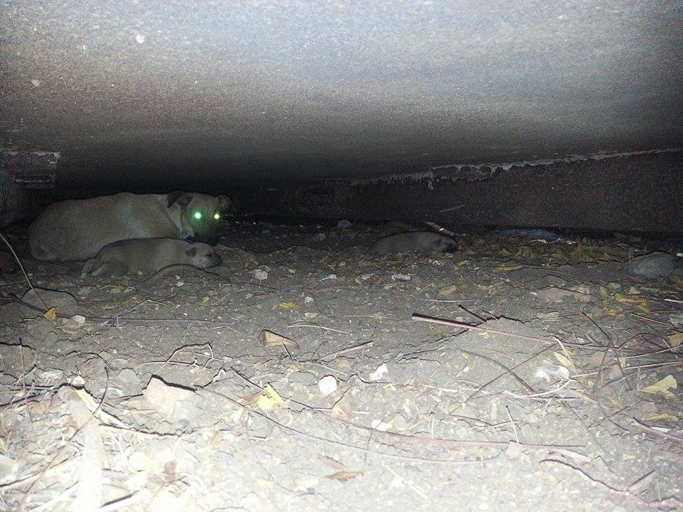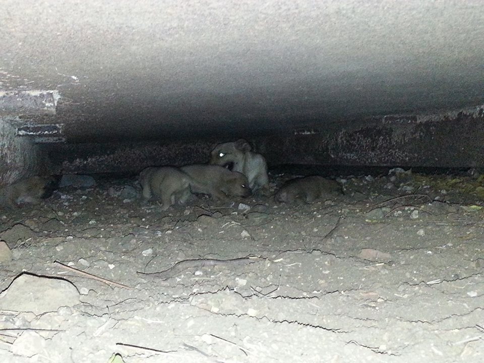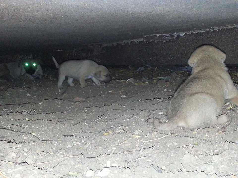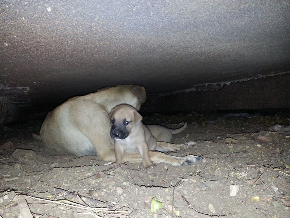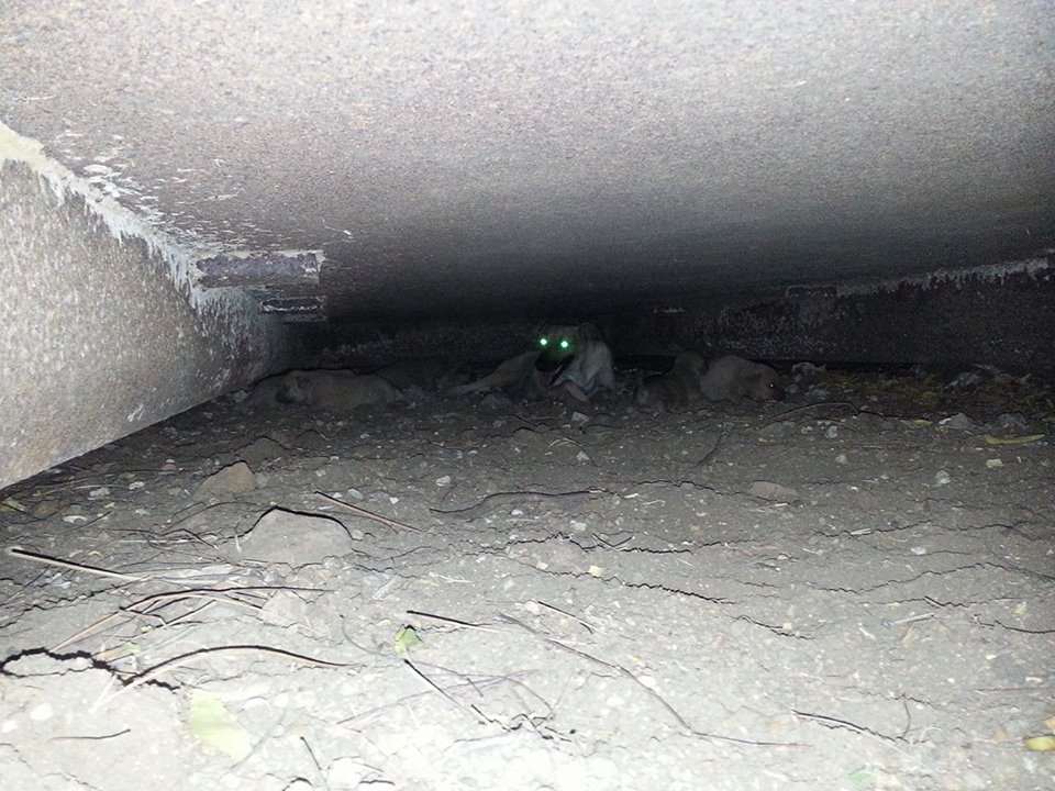 De volgende dag ben ik met Fien gaan zoeken en we vonden 5 pups onder de container. Fien zag ze het eerst en mama Wendy lag er bij. Ze lagen ver naar achter en we konden er niet bij.