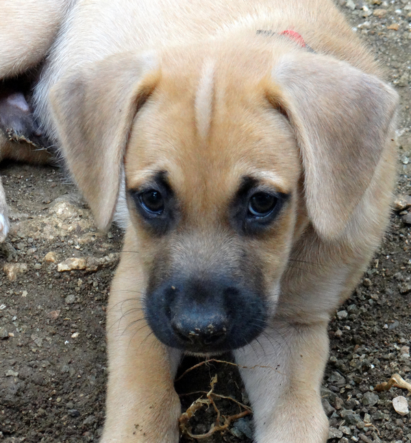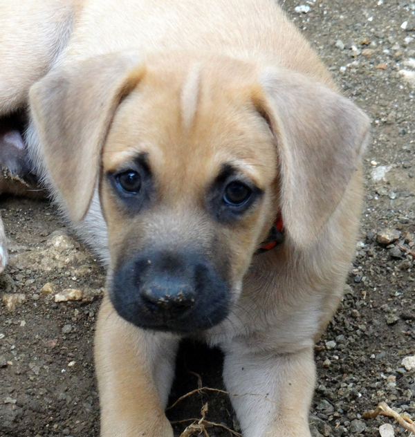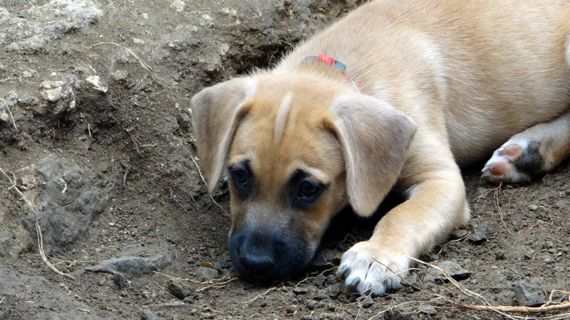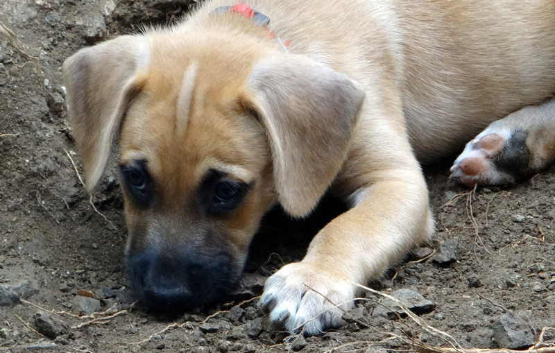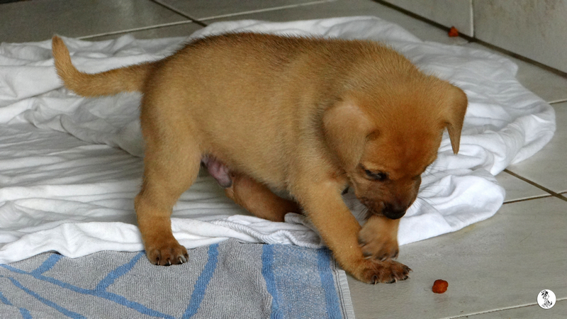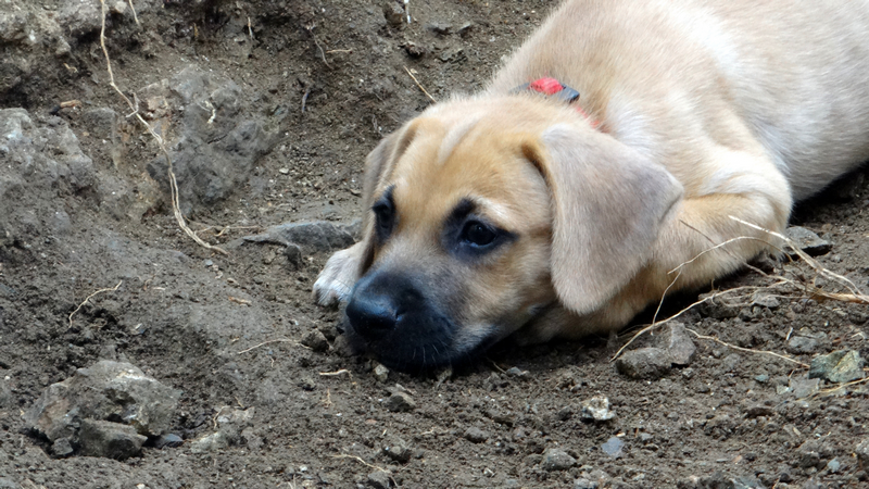 Toen de pups. Dyveke is op haar buik bijna onder de container gaan liggen en met de vangstok wist ze de hondjes zo te porren dat ze ze kon pakken. Ik stond achter haar en pakte de pups aan en hield een zeer zenuwachtige Wendy in de gaten.