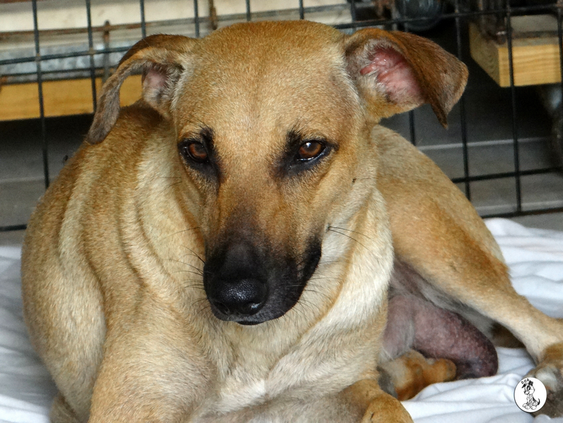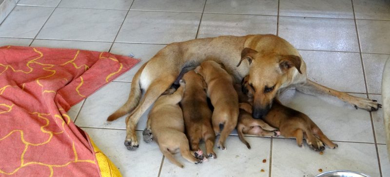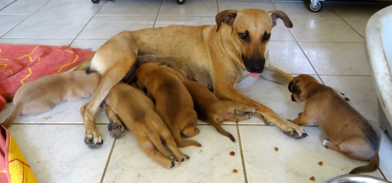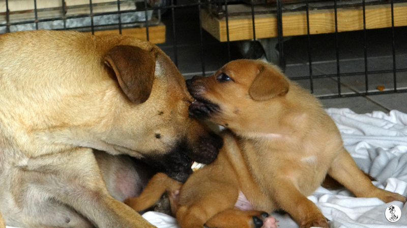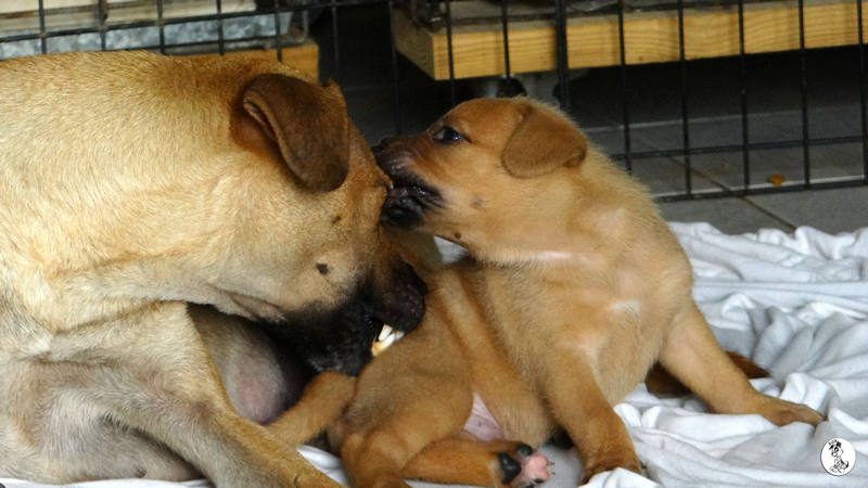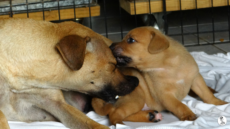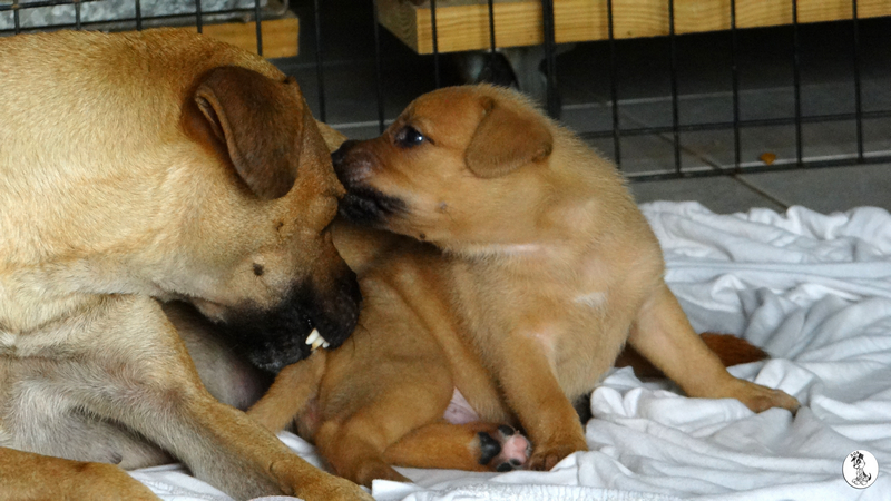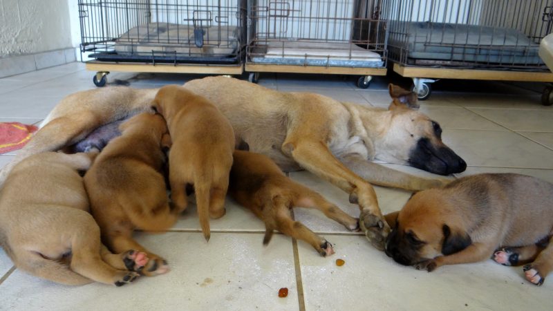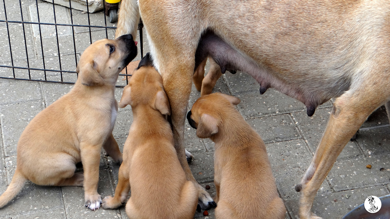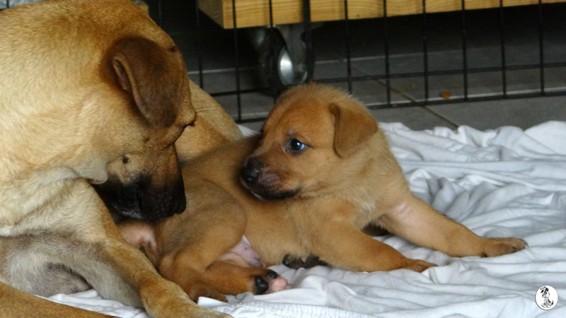 Wendy is een schatje, heel zorgzaam en alert , maar iedereen mag de pups aaien. Na even wennen , eten en drinken, kon ze heerlijk slapen.