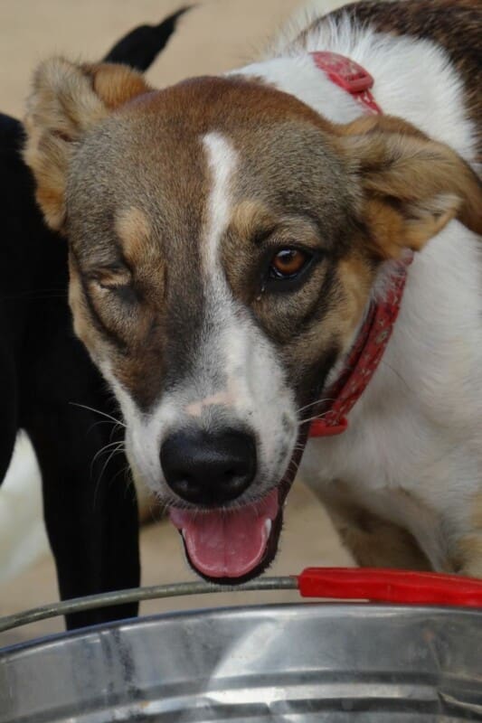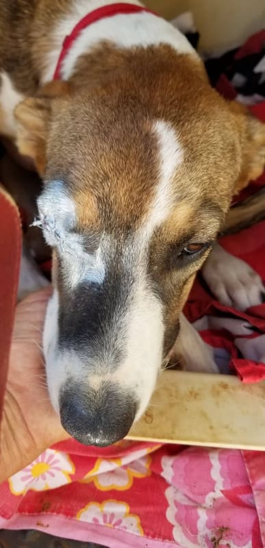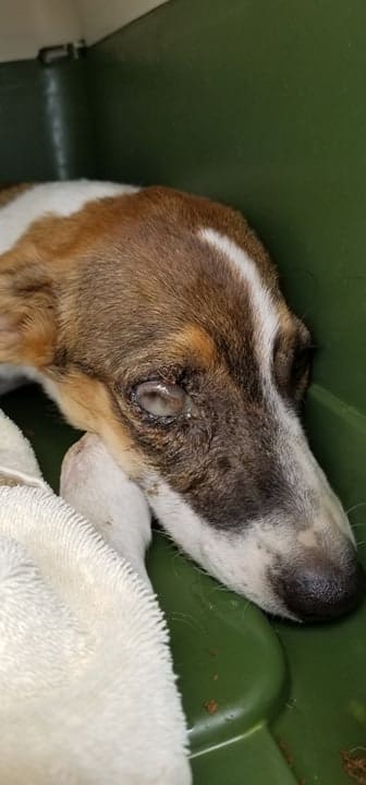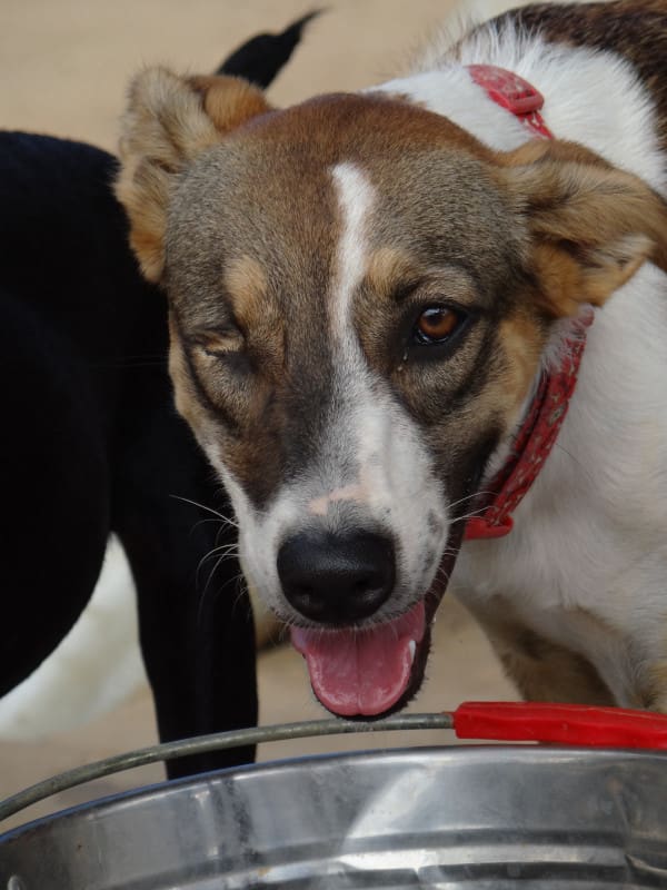 Toen ik in juni 2019 Sandra zou gaan helpen om een nestje puppy’s uit de knoek te redden (de Disneypups), reed ik over de weg naar Bullenbaai. Ineens schoot er een klein hondje/pup voor de auto en bleef voor mij uitrennen… wel 110 meter en schoot toen de knoek in. Ik ben gestopt maar verwachte dat het hondje ver de knoek ingerend zou zijn. Dat bleek niet waar, ze lag vlak bij de rand van de weg onder wat struiken. Op mijn knieën en kletsend ben ik naar haar toe gekroppen en ze begon zo waar te kwispelen. Ik heb haar op getild en in de auto gezet (in een bench, want ik had er 3 mee voor de puppy’s). Ik zag meteen dat haar oogje niet goed was… Bij de dierenarts hebben we besloten haar eerst te laten aansterken en medicijnen voor haar oogje te geven.