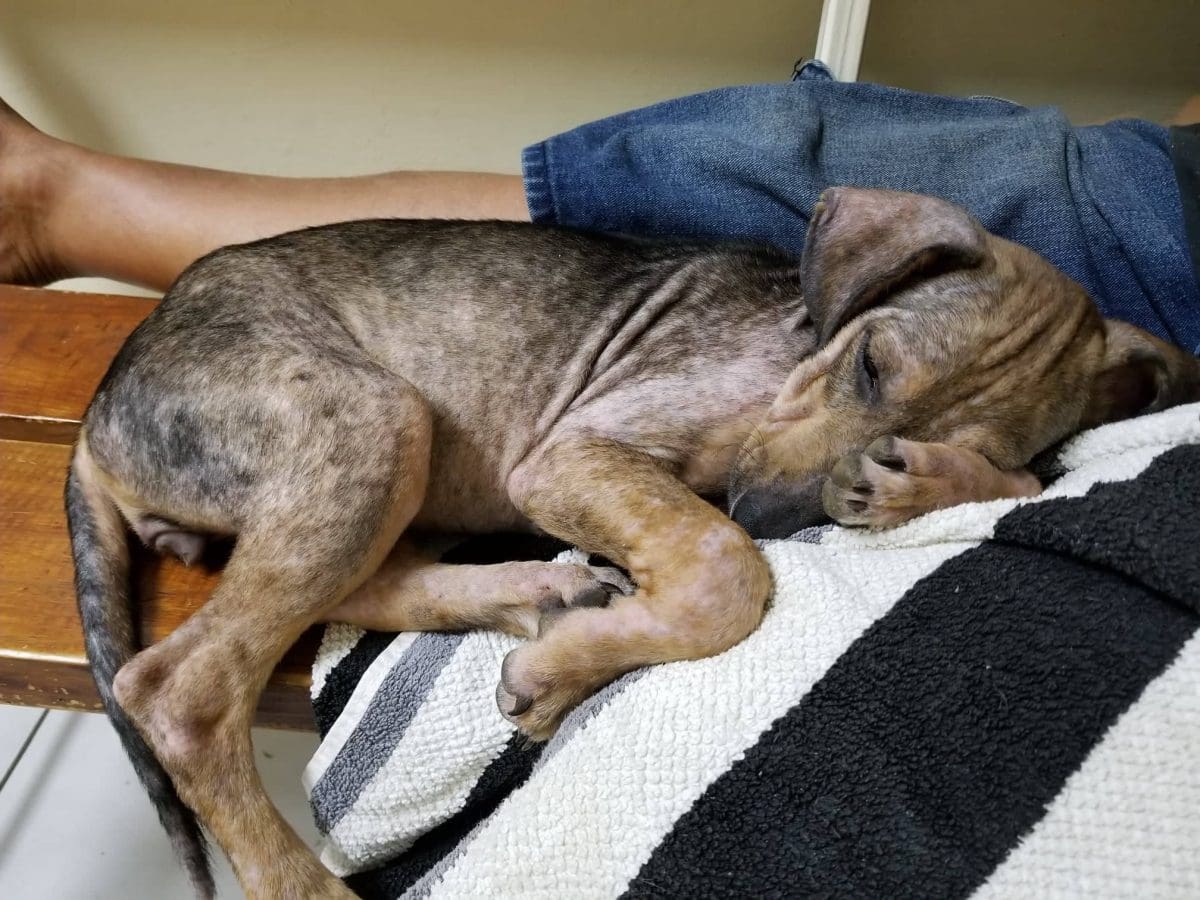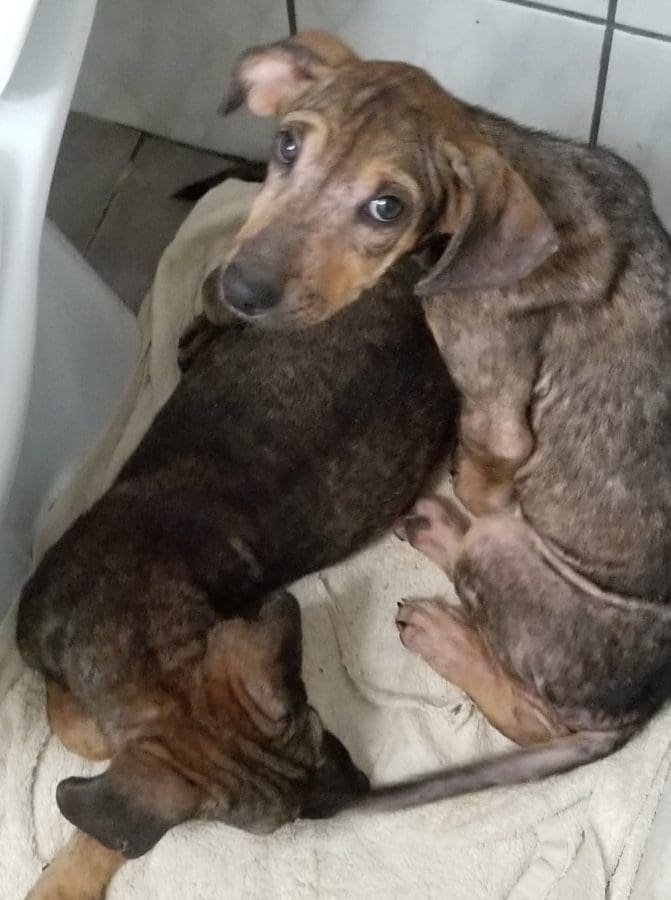 Begin december 2018 kreeg ik een appje in het Spaans. Nou is mijn Spaans/Papiaments bitter slecht maar “yuda mi” en 3 foto’s van pupjes in de knoek was een duidelijke boodschap. Gelukkig konden vrijwilligers (Hetty en Ivo) er langs rijden en samen met de zeer vriendelijke dame zijn de pups gevangen en naar DOG gebracht. Ze waren warm en kaal van de schurft. Meteen begonnen met Ivomec prikken, lekker eten en verwennen.